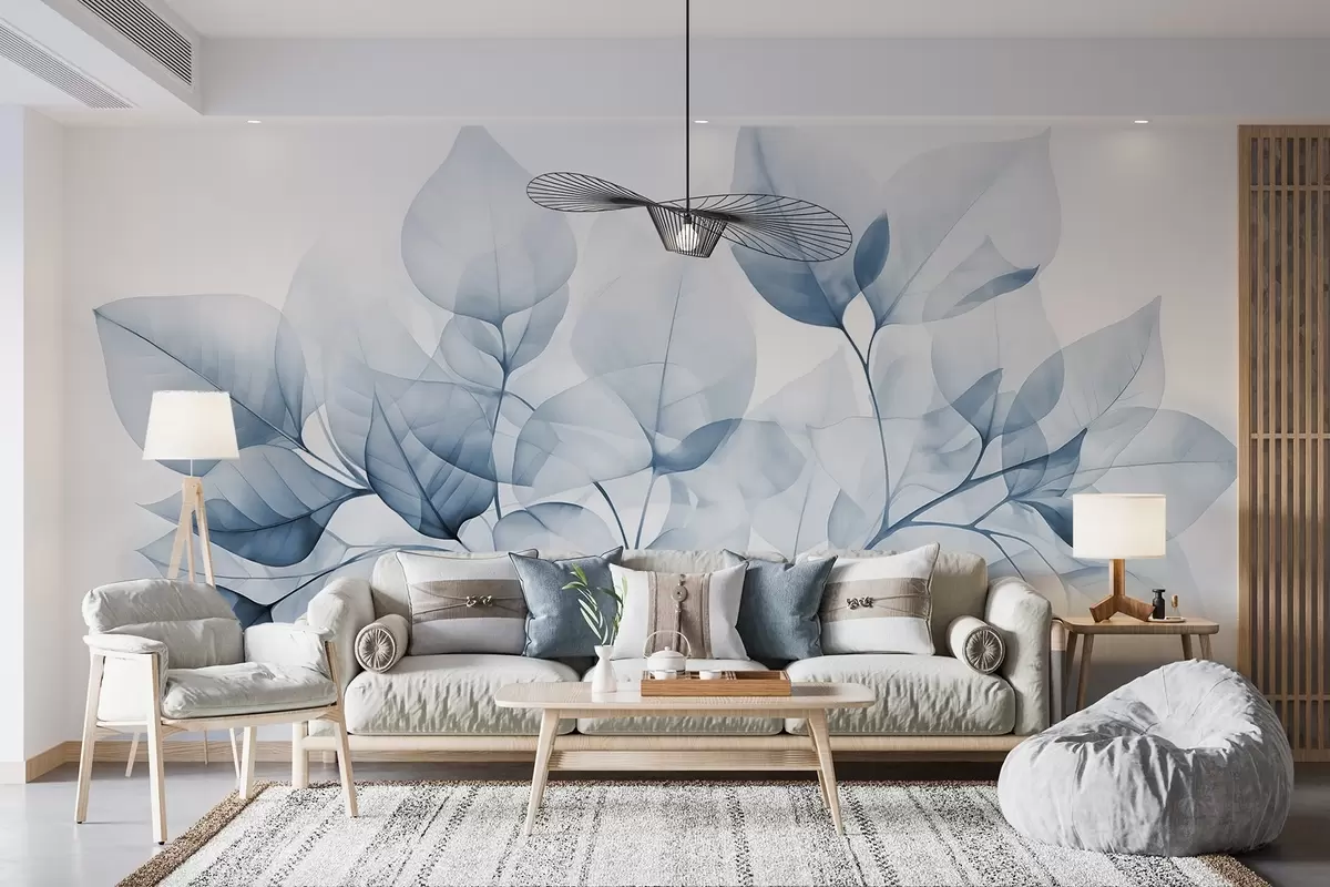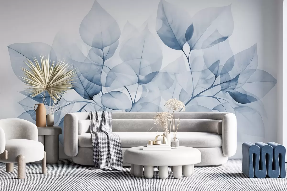 Papier peint Aquarelle de feuilles translucides aux couleurs pastel, avec des nuances de blanc et de bleu N° w08910v1
