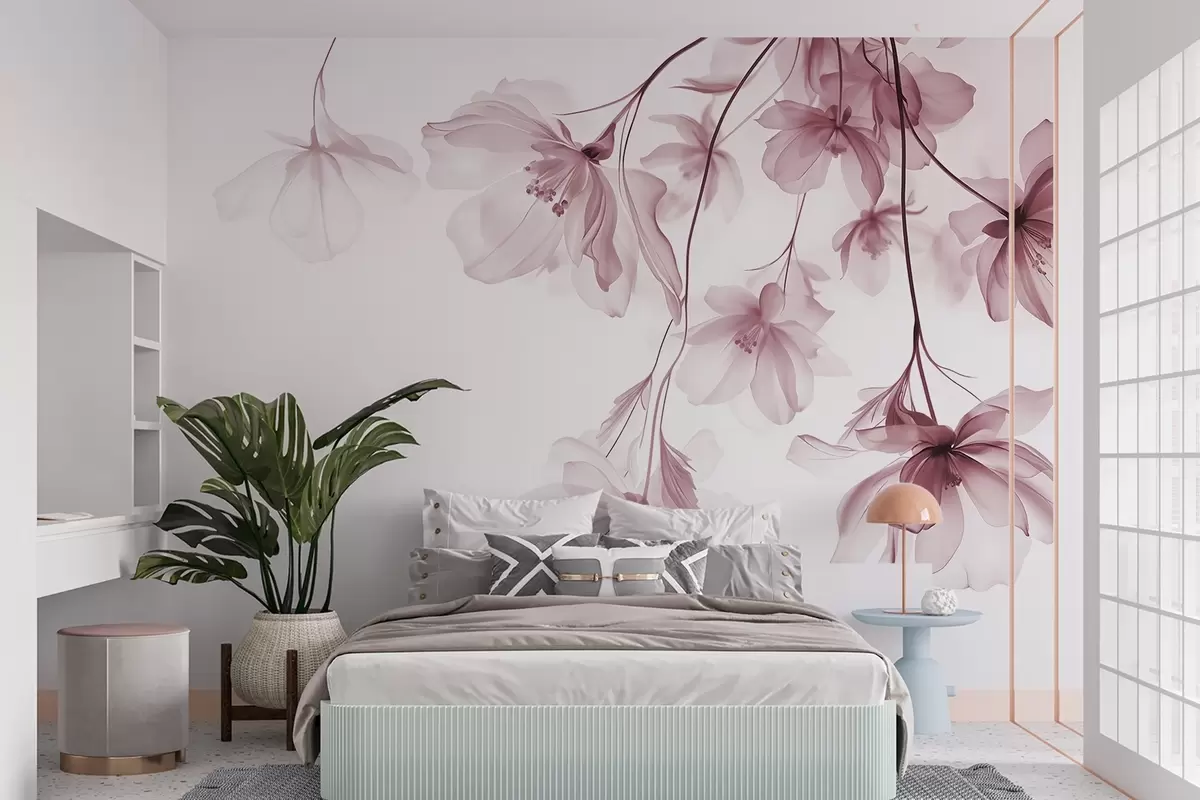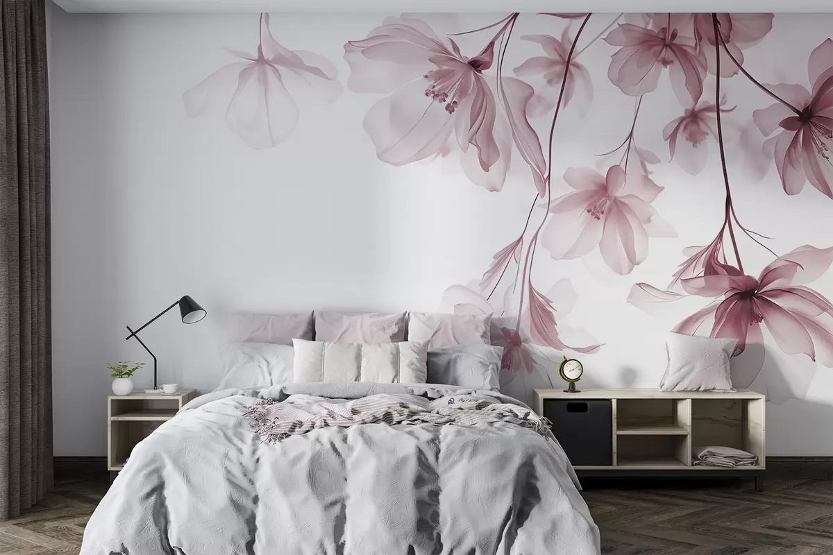 Papier peint Fleurs roses aux pétales translucides suspendues à une branche, rose et blanc, composition d'art moderne minimaliste N° w08911v2