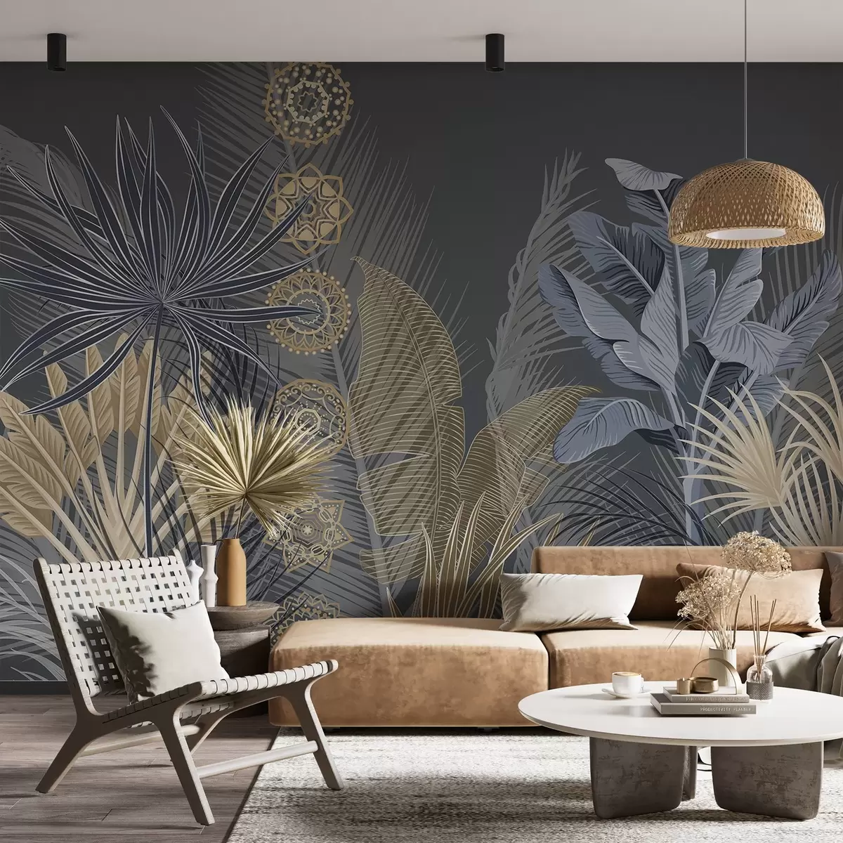 Papier peint Feuilles tropicales dans les tons bleus et bruns, feuilles de palmier, feuilles de bananier et ornements de mandala, fond sombre N° w08913
