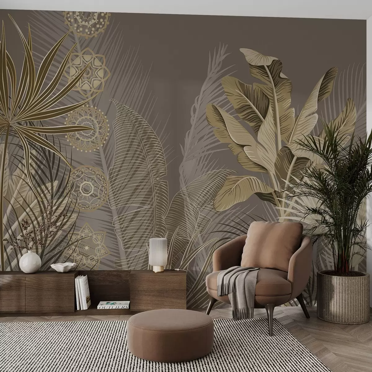 Papier peint Feuilles tropicales dans les tons beige et brun, feuilles de palmier, feuilles de bananier et ornements de mandala, fond sombre N° w08913v1