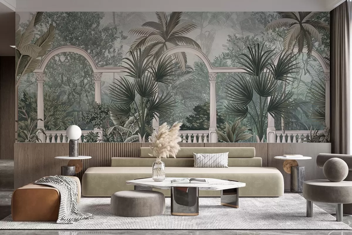 Papier peint Jardin tropical texturé avec palmiers et végétation luxuriante, balustrade avec arches, couleurs sourdes, style vintage N° w08916