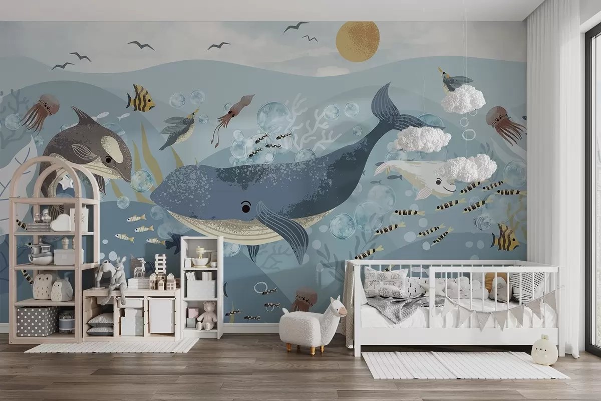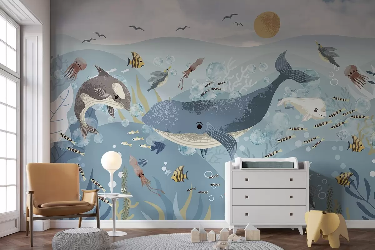 Papier peint Illustration pour enfants avec une baleine bleue entourée de poissons, de calamars et de méduses dans un océan bleu avec des bulles N° w08921