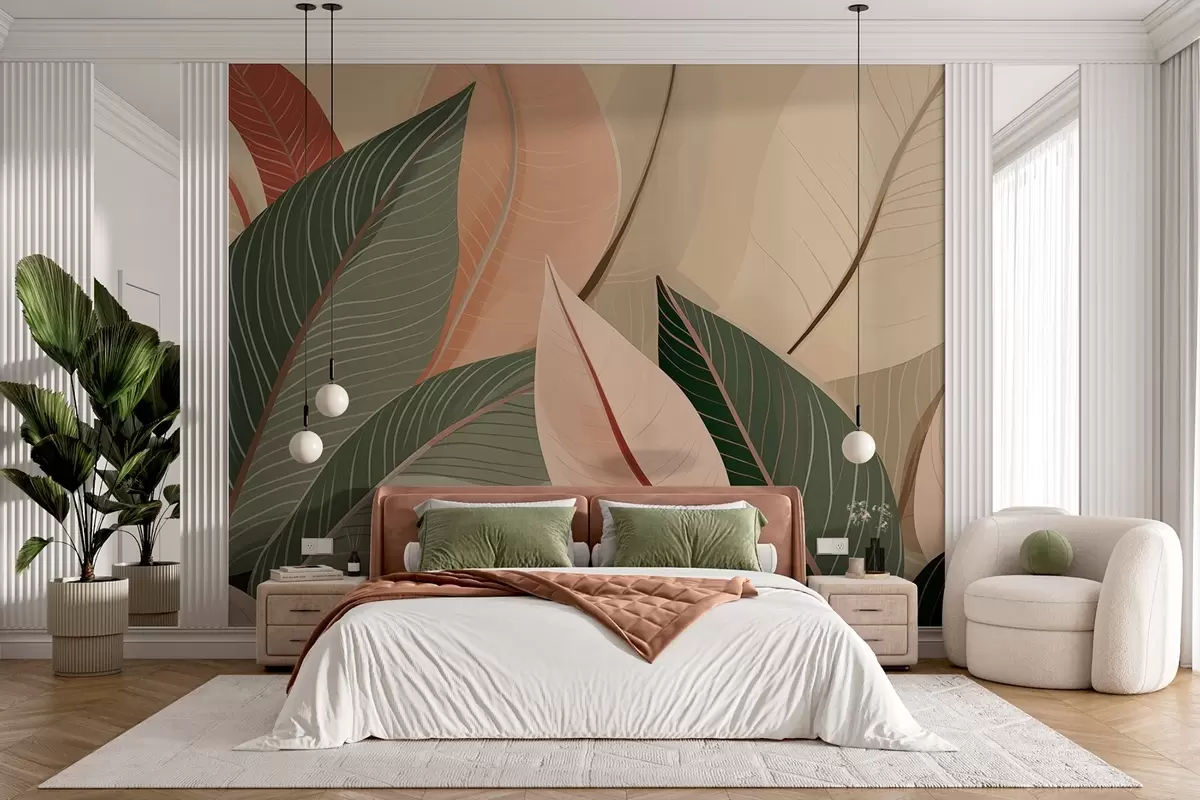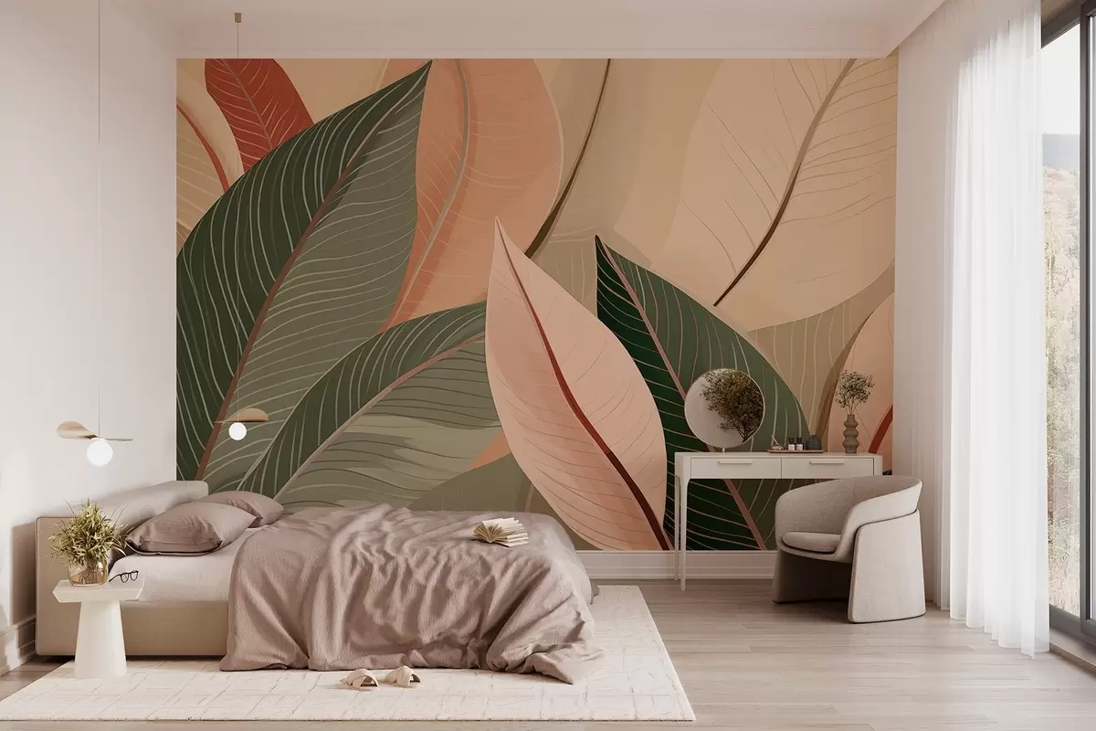 Papier peint Gros plan sur des feuilles de couleur vert olive et rose-crème N° w08944