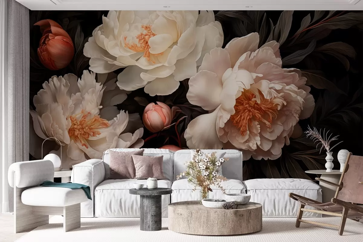 Papier peint Grandes pivoines blanches avec bourgeons rouges sur fond sombre N° w08965