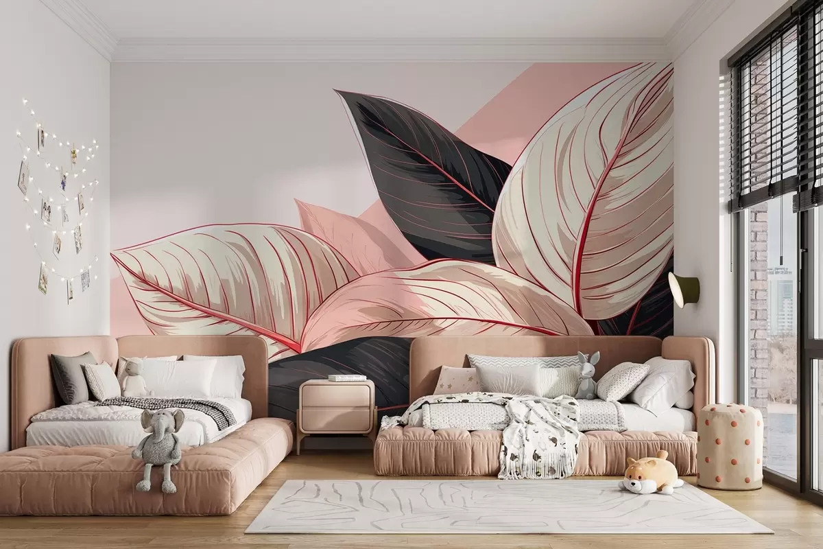 Papier peint Grandes feuilles tropicales gris-rose avec un fragment rose N° w08970v1