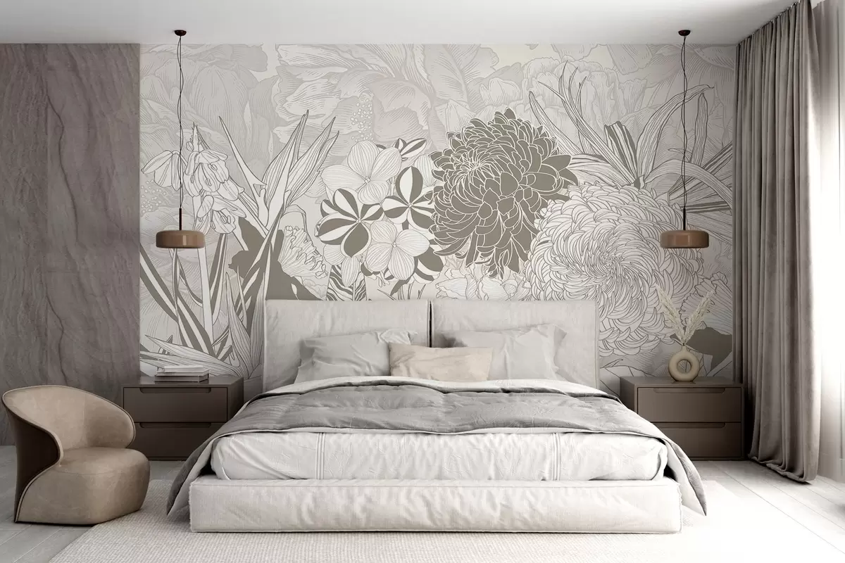 Papier peint Fleurs et feuilles dans les tons beiges, y compris chrysanthèmes, plumeria et feuillage tropical, dessin botanique N° w08976