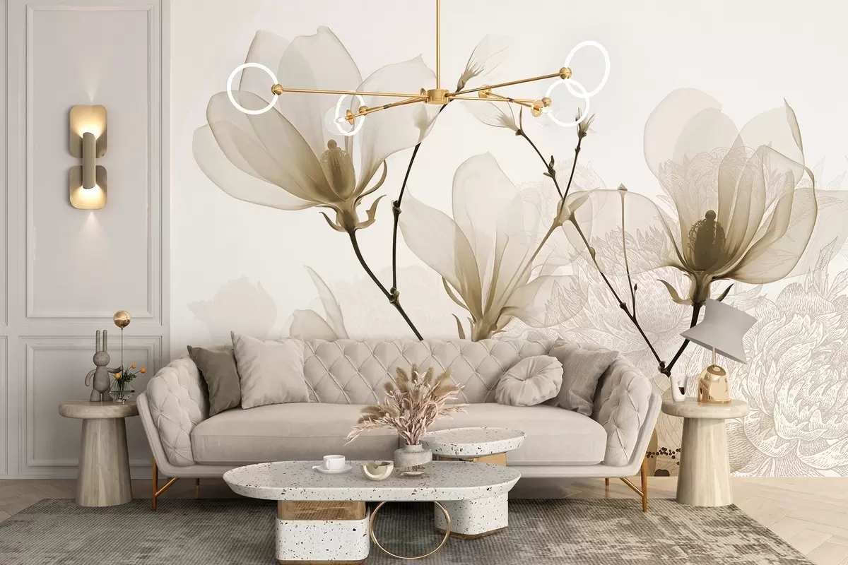 Papier peint Fleurs de magnolia beige translucide avec silhouettes de fleurs aux pétales délicats et aux tiges foncées N° w08978v1
