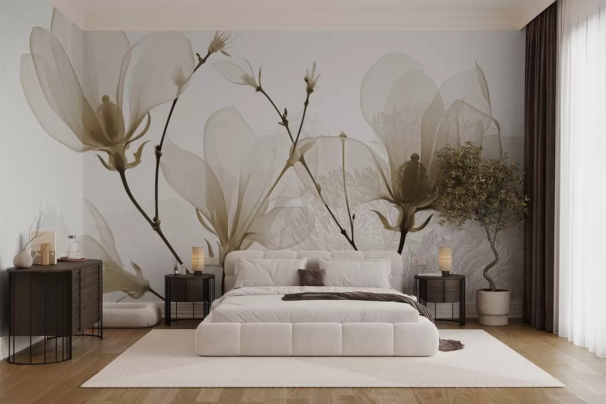 Papier peint Fleurs de magnolia beige translucide avec silhouettes de fleurs aux pétales délicats et aux tiges foncées N° w08978v1