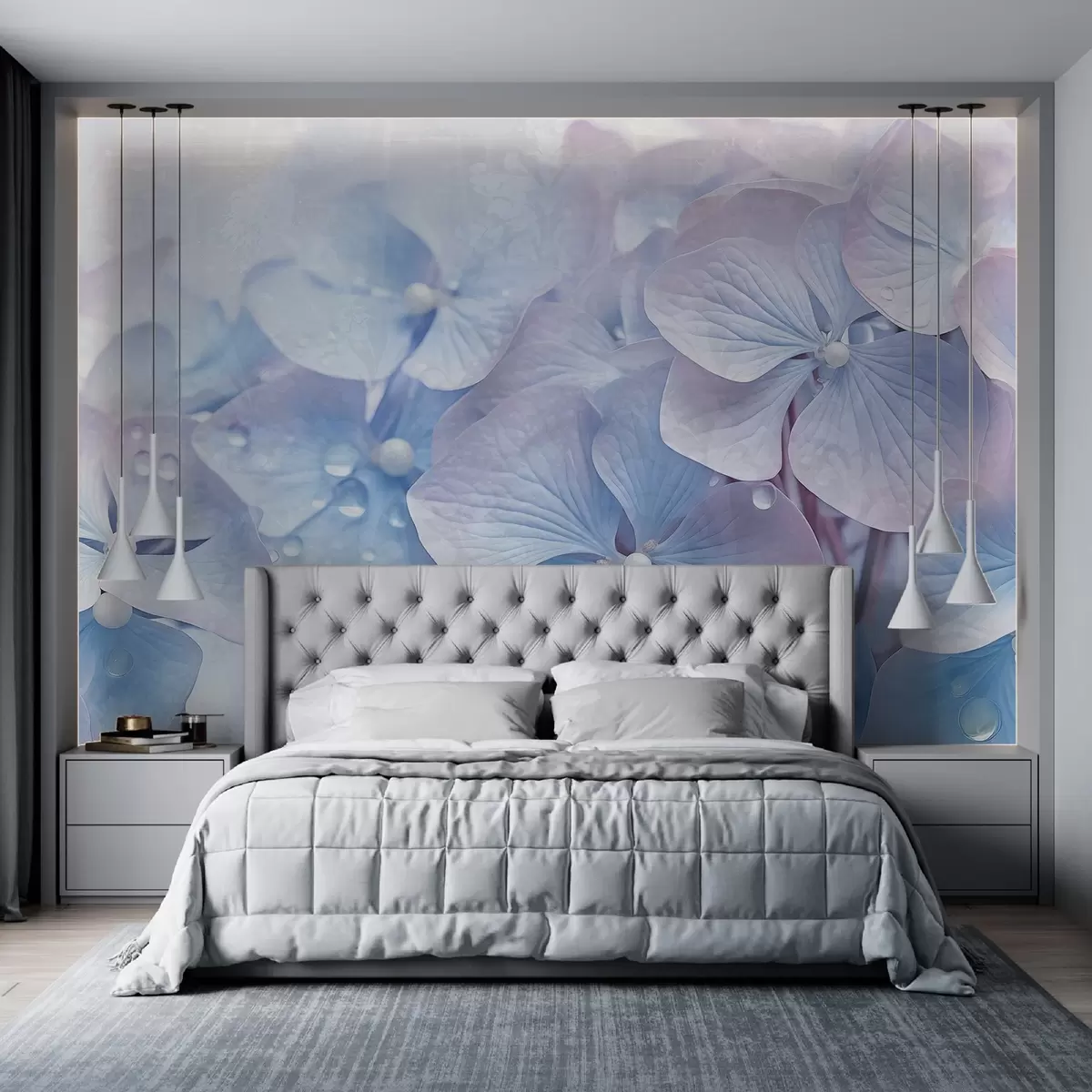 Papier peint Fleurs d'hortensia vintage texturées bleues et roses avec des gouttes d'eau sur les pétales, fond rose flou N° w08981