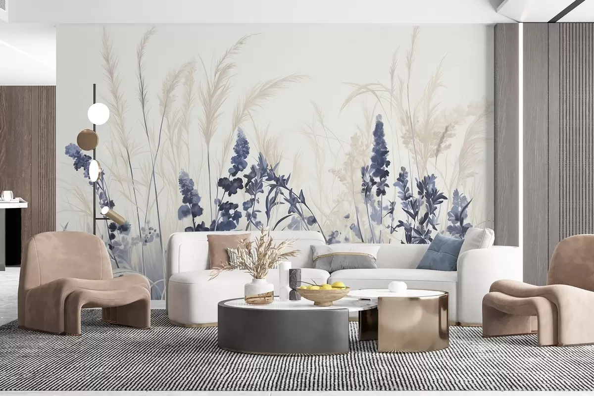Papier peint Fleurs bleues et roseaux beiges dans un champ, texture de peinture minimaliste, fond clair, couleurs douces, coups de pinceau délicats N° w08982