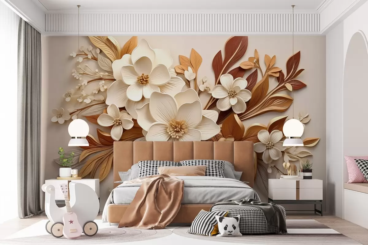 Papier peint fleurs 3D avec feuilles en style origami dans les tons beiges N° w08984