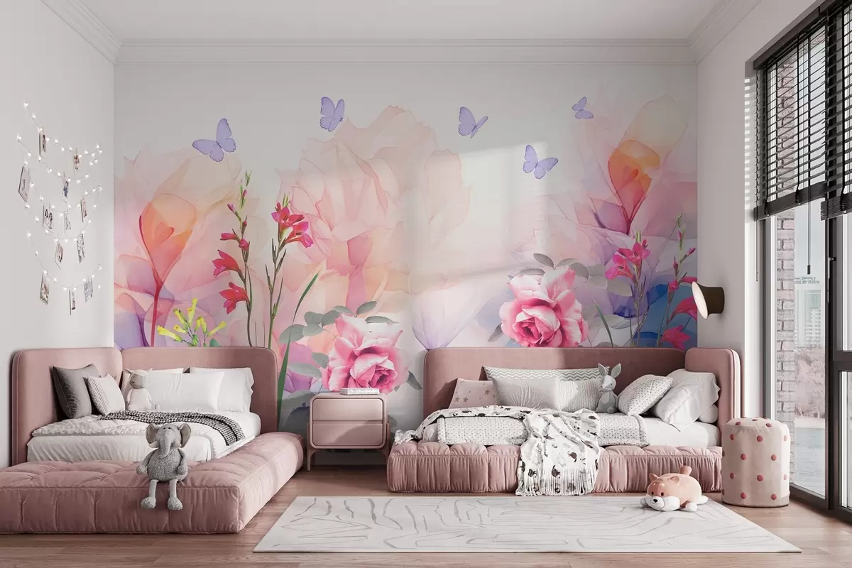 Papier peint Fleurs avec papillons et roses en style aquarelle N° w09002