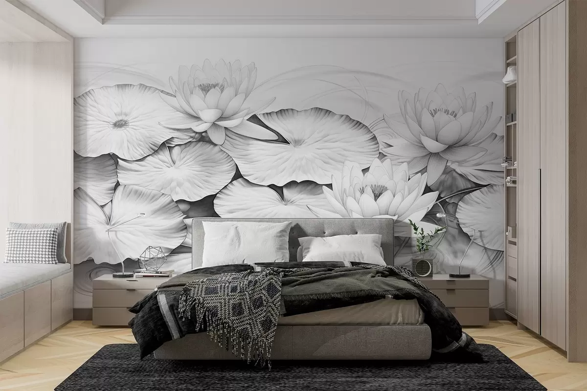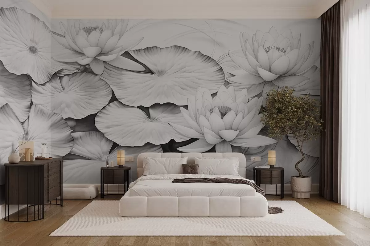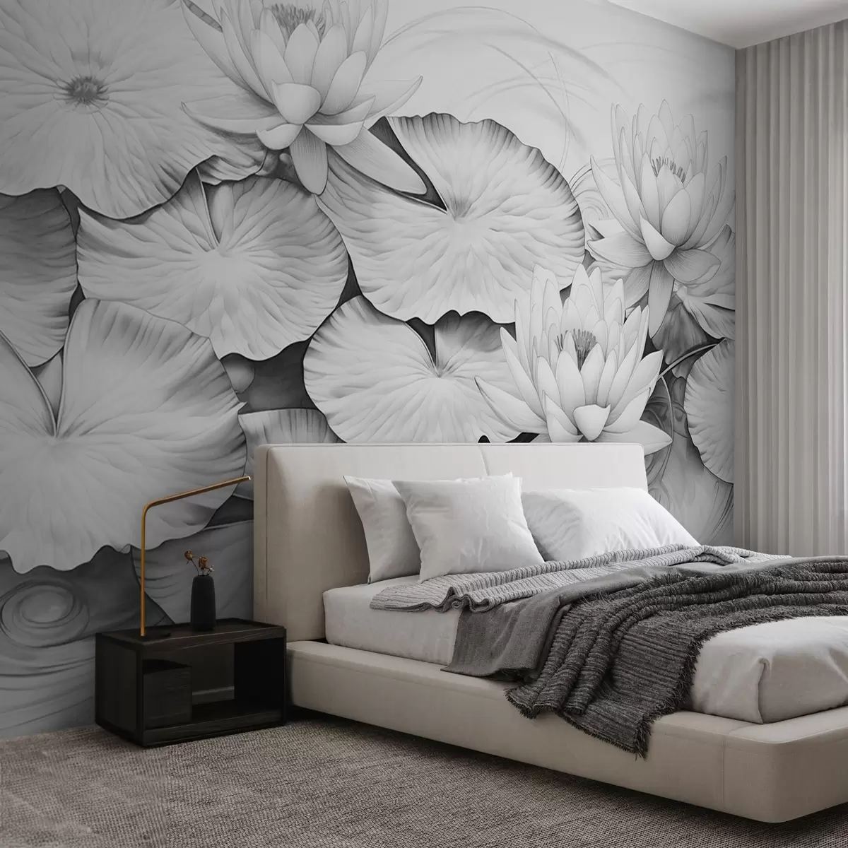 Papier peint Nénuphars et nymphéas dans un étang, imitation en noir et blanc d'un dessin au crayon, illustration botanique détaillée, art de la nature N° w09006