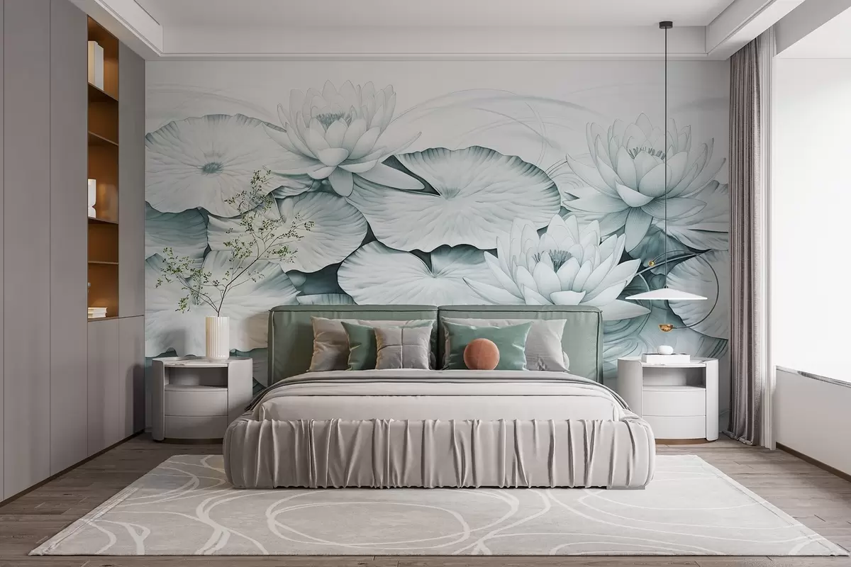Papier peint Nénuphars et nymphéas dans un étang, turquoise et blanc imitation de dessin au crayon, illustration botanique détaillée, art de la nature N° w09006v1