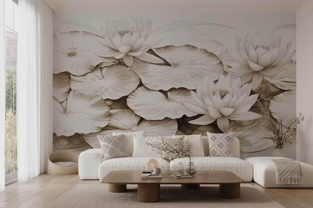 Papier peint Nénuphars et nymphéas dans un étang, imitation brune et blanche d'un dessin au crayon, illustration botanique détaillée, art de la nature N° w09006v2
