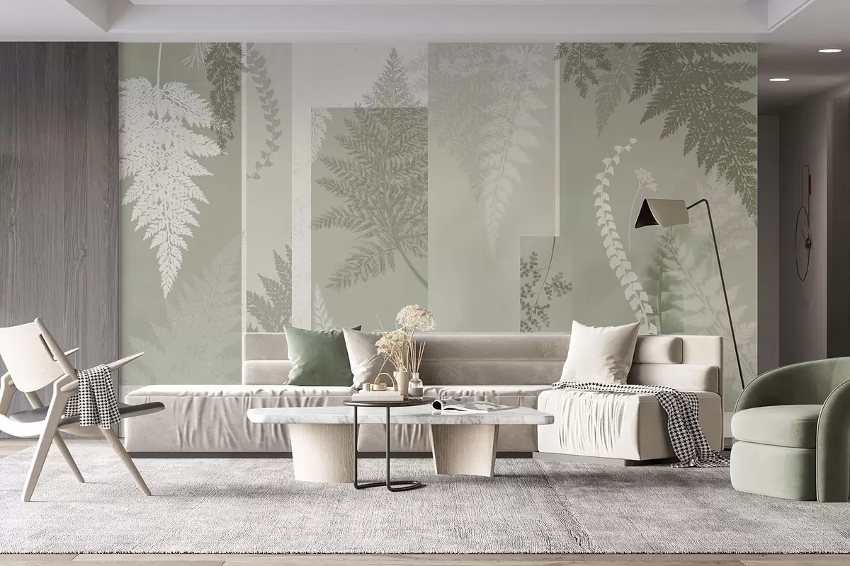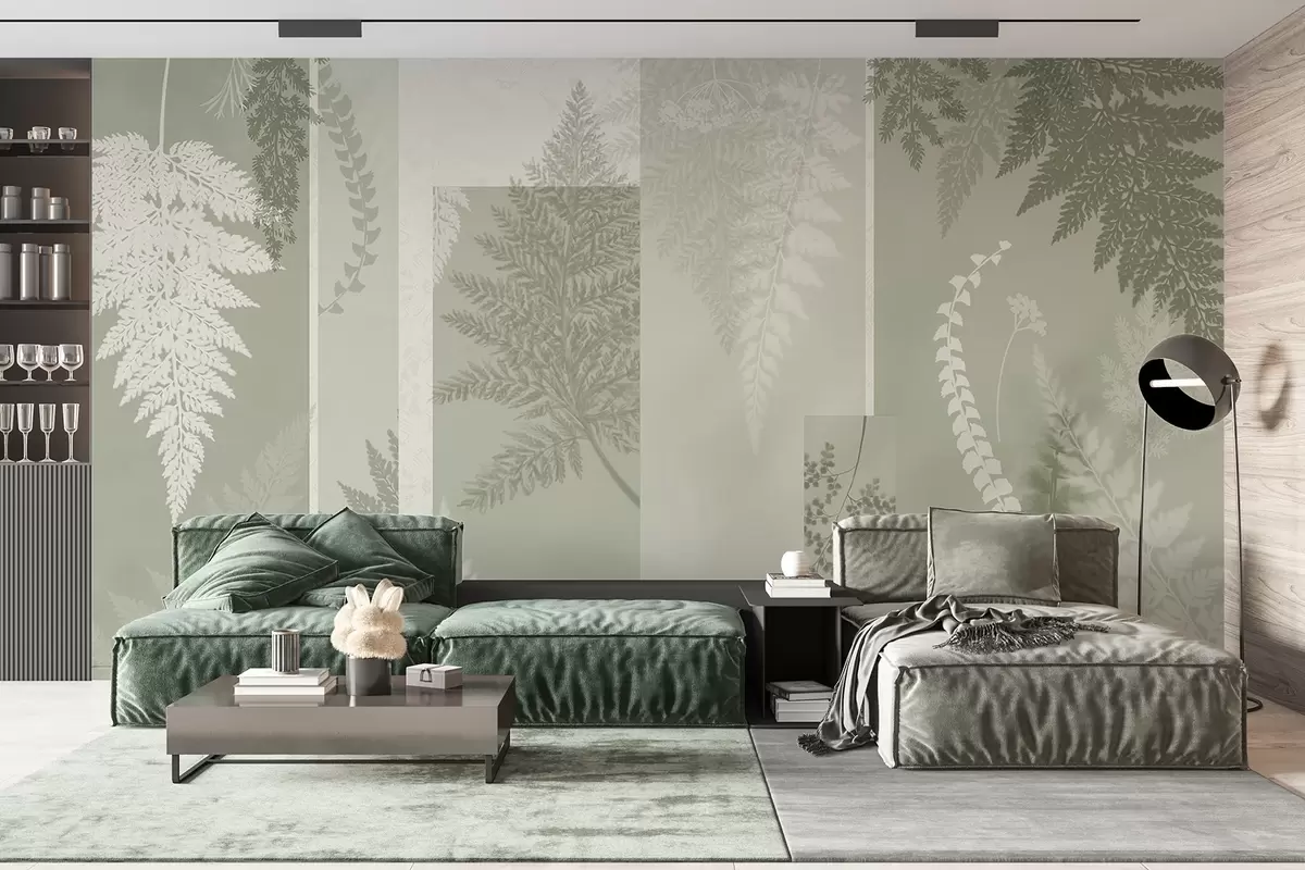 Papier peint Feuilles de fougère vertes et blanches, disposées en bandes verticales, créant un imprimé botanique et minimaliste, aux couleurs douces et sourdes N° w09007v2