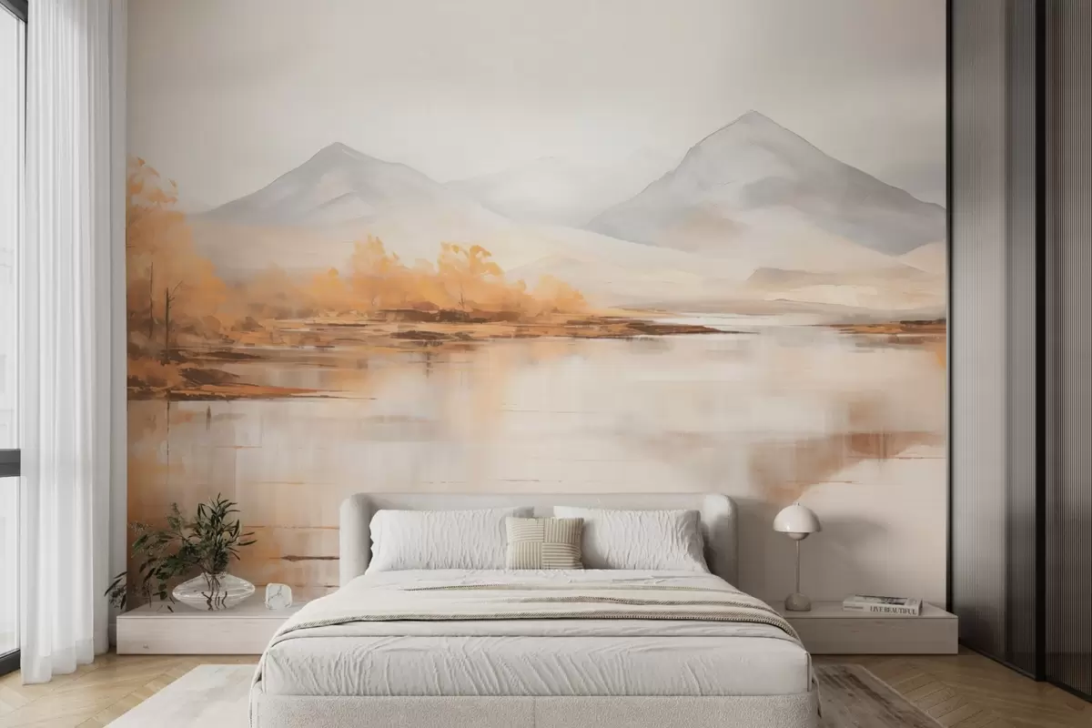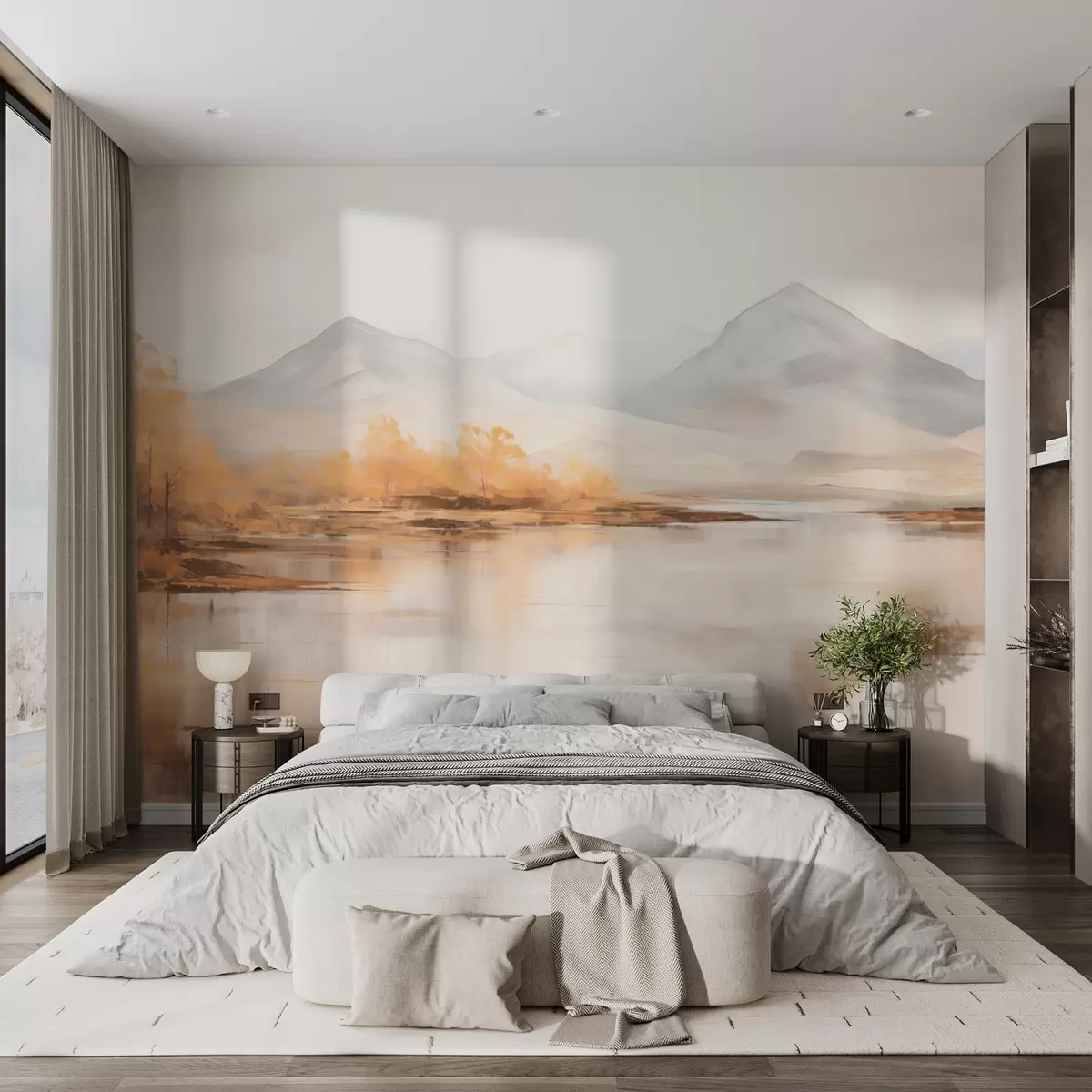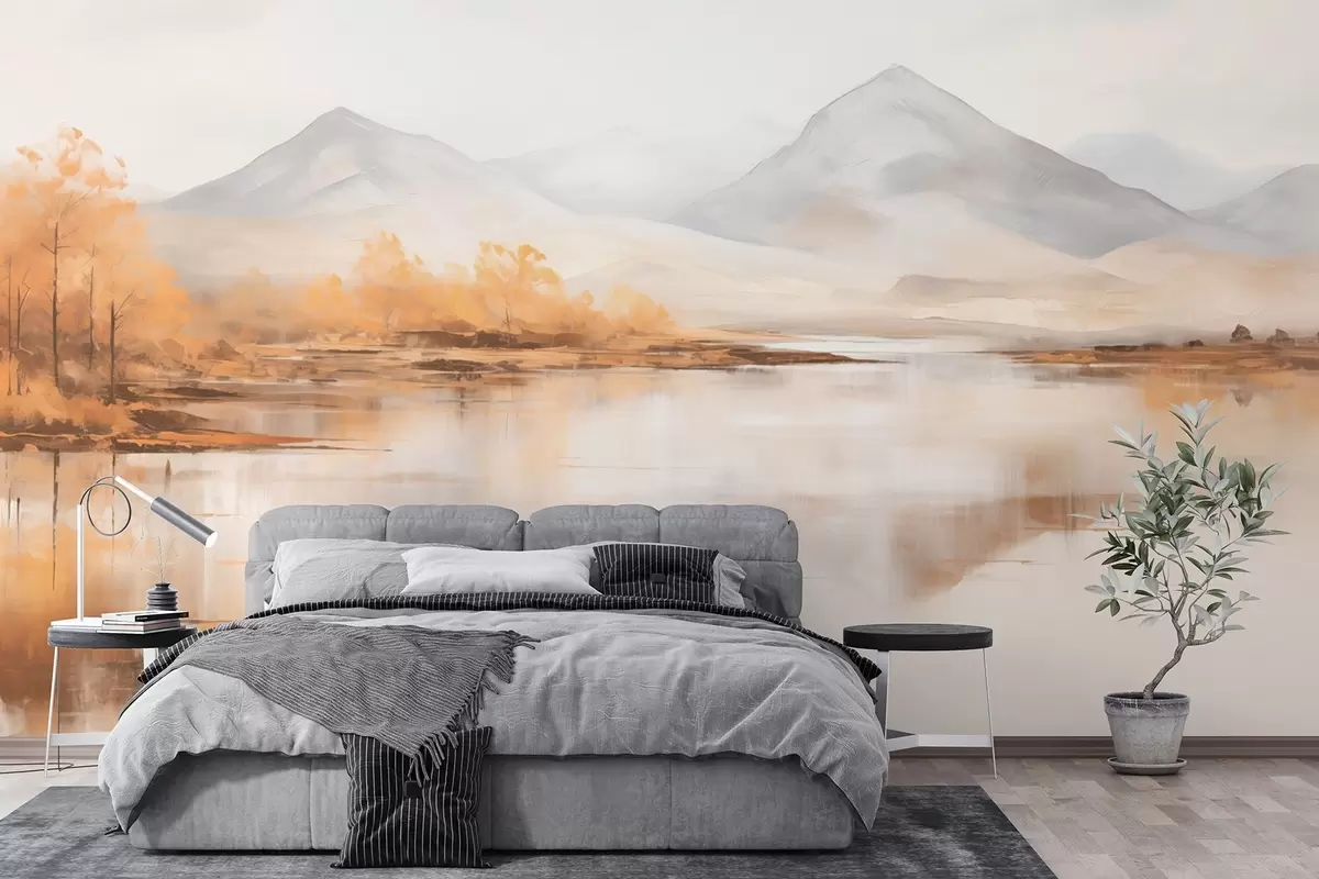 Papier peint Paysage d'automne avec des arbres jaunes et une rivière sur fond de montagne N° w09020