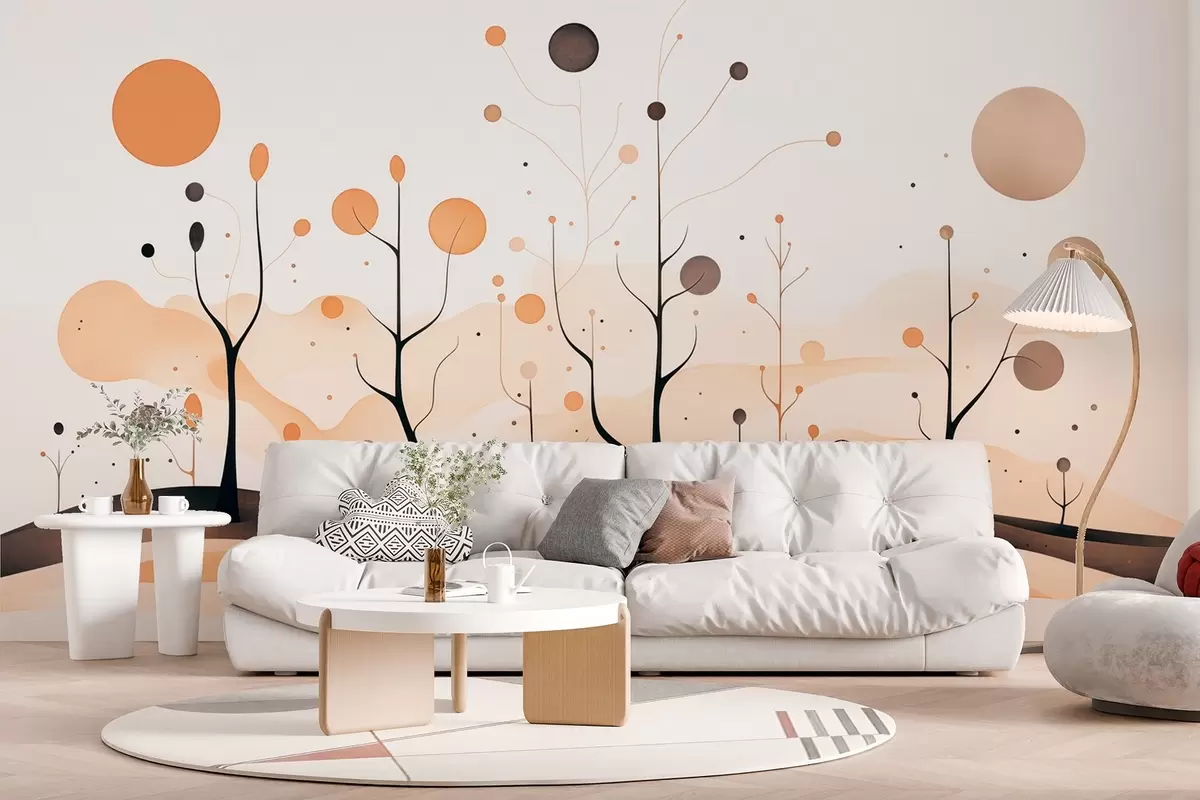 Papier peint Arbres abstraits avec sphères et soleil dans les tons beige-gris N° w09043