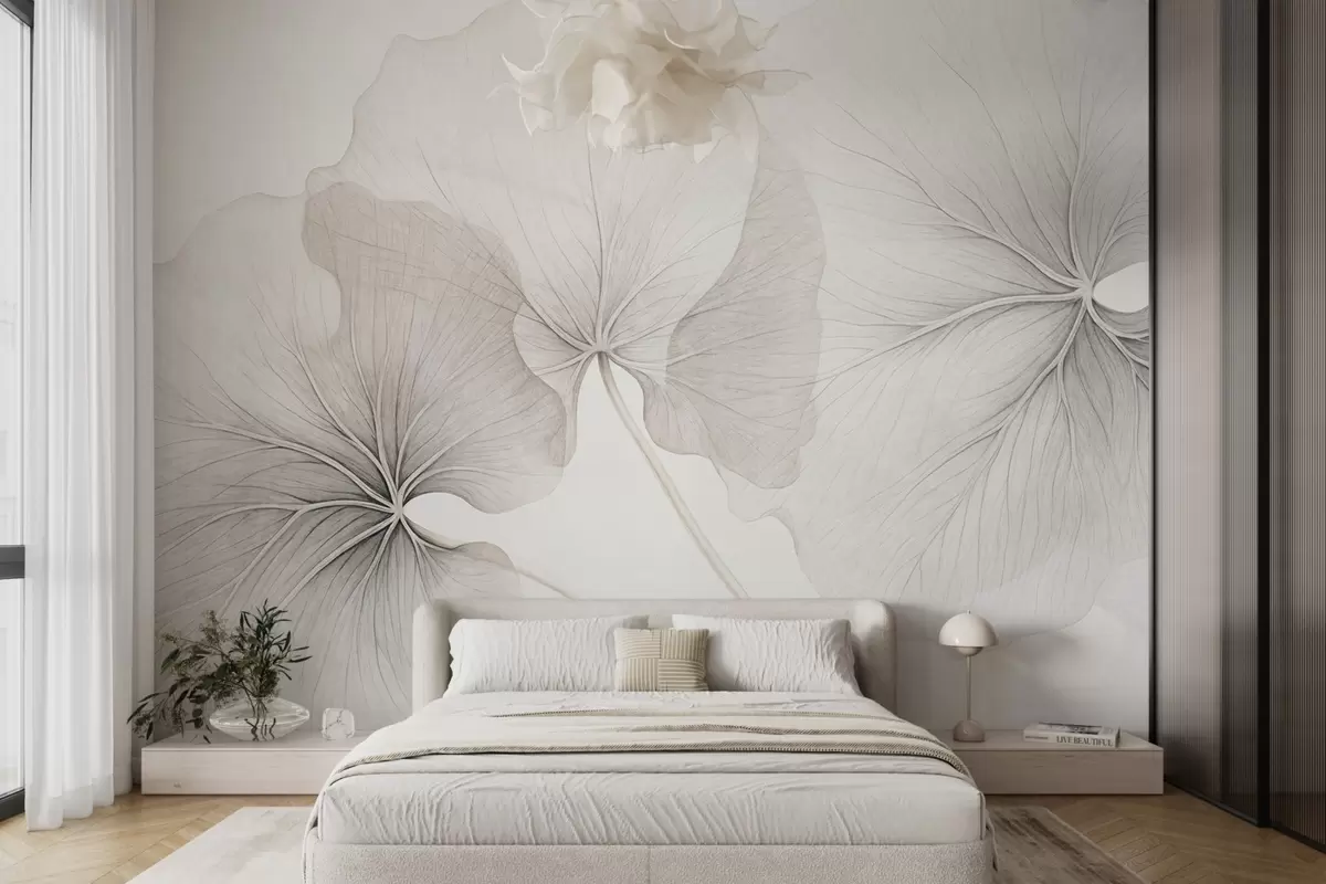 Papier peint Trois feuilles translucides aux nervures visibles, à la texture bruyante se chevauchant légèrement, avec de fines tiges sur un fond blanc N° w09052