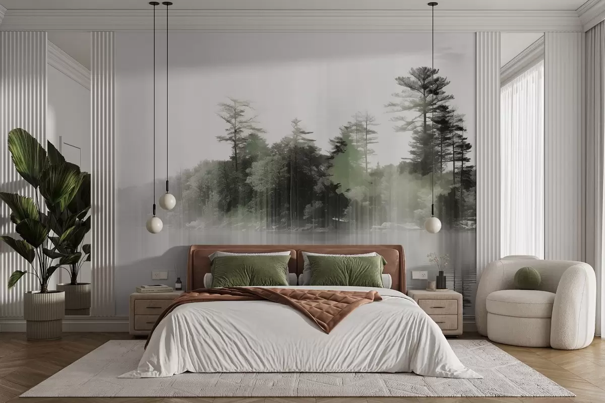 Papier peint Paysage abstrait minimaliste texturé avec un lac et des arbres se reflétant dans l'eau dans des tons verts et blancs N° w09058