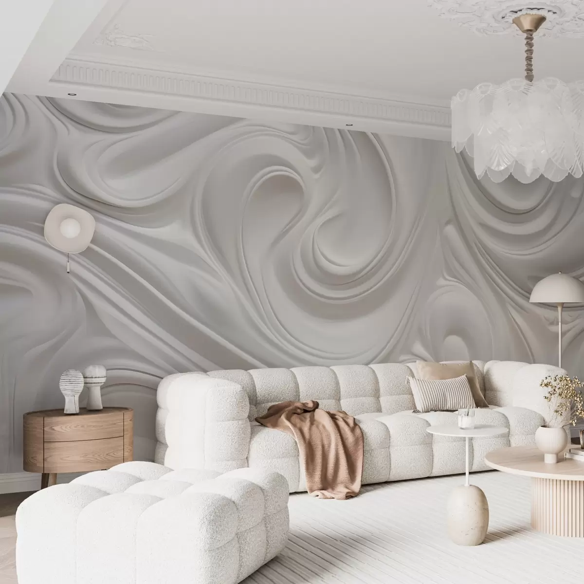 Papier peint Art moderne abstrait blanc avec des tourbillons et des vagues fluides, texture lisse, design élégant, esthétique minimaliste N° w09059