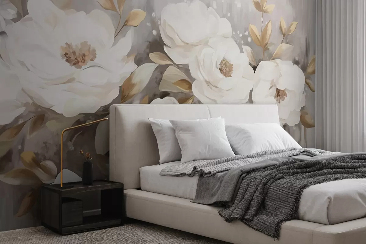Papier peint Fleurs blanches avec feuilles jaunes, pétales doux, arrangement floral délicat, palette de couleurs neutres, coups de pinceau texturés N° w09062