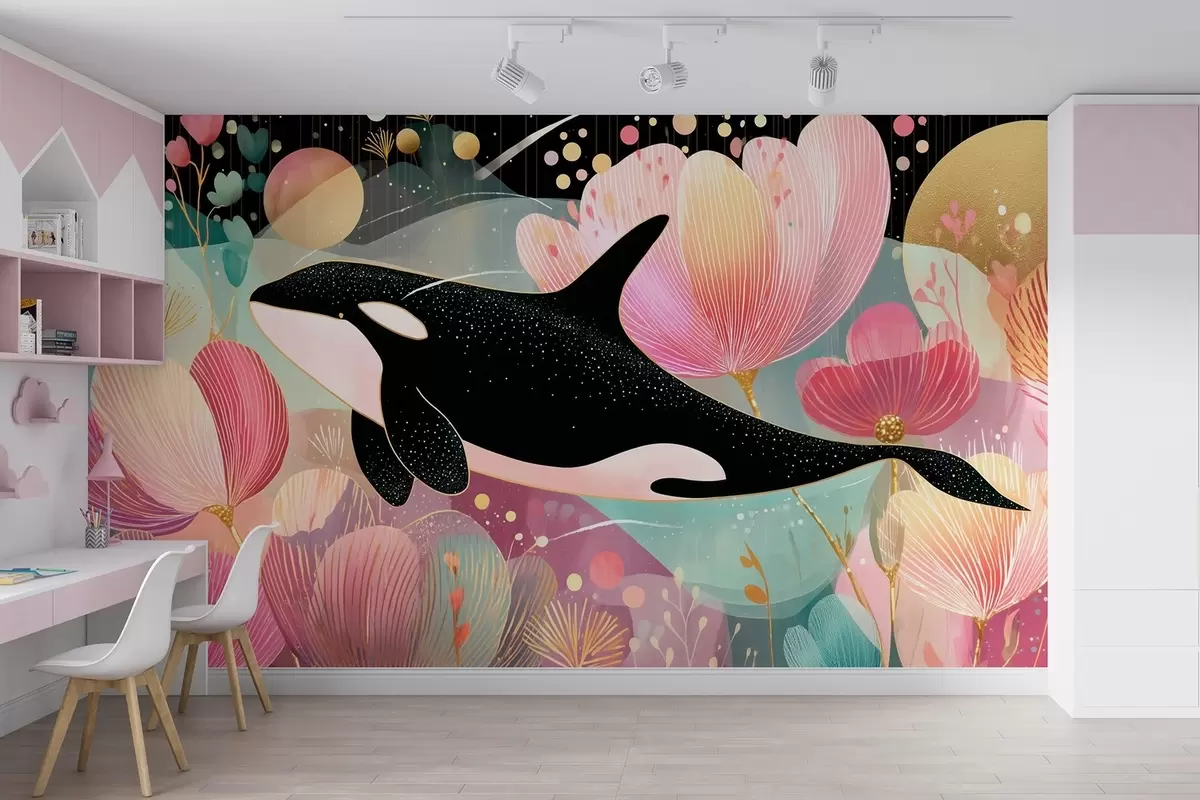 Papier peint Un orque noir nageant sur fond de fleurs roses N° w09074