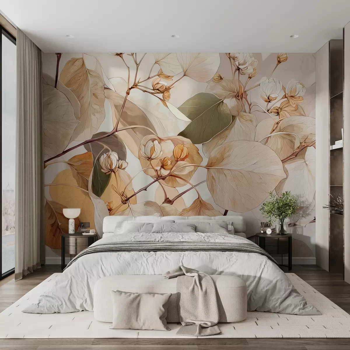 Papier peint Branches de trembles, feuilles et fleurs en peinture à l'huile dans les tons beiges N° w09082