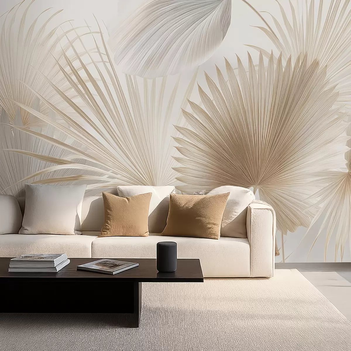 Papier peint Éventails de feuilles tropicales douces dans des tons beige clair et bleutés N° w09084