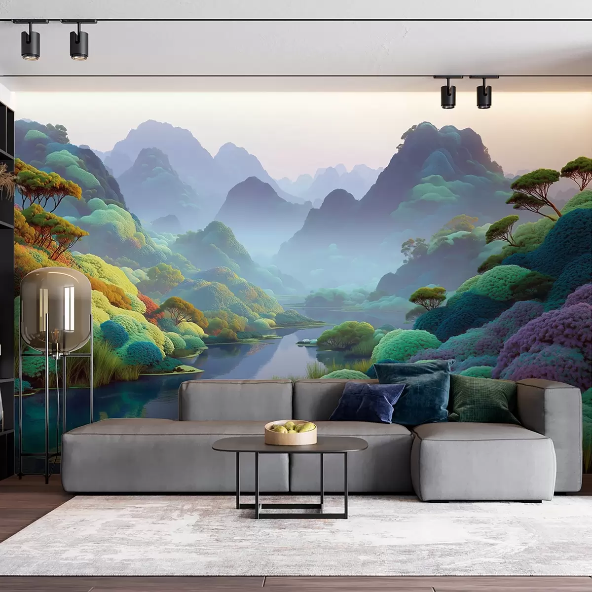 Papier peint Paysage de montagne avec une rivière dans les tons bleus avec des arbres et des buissons N° w09088