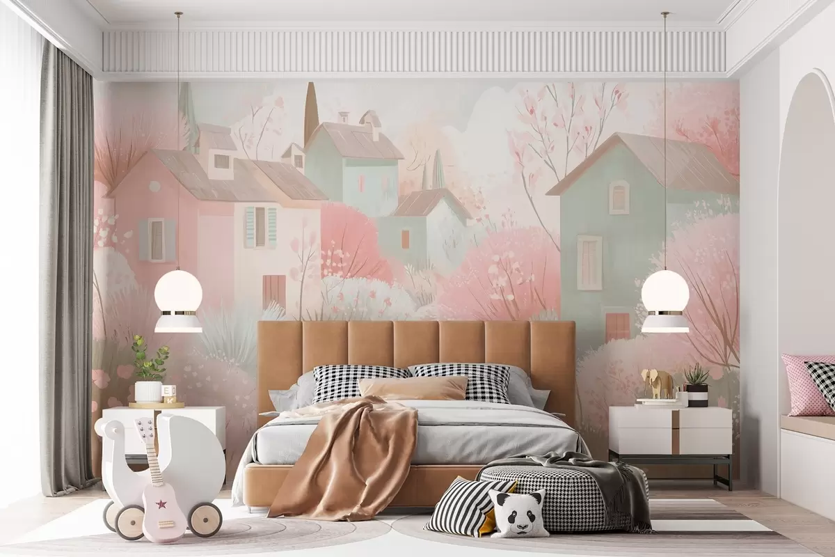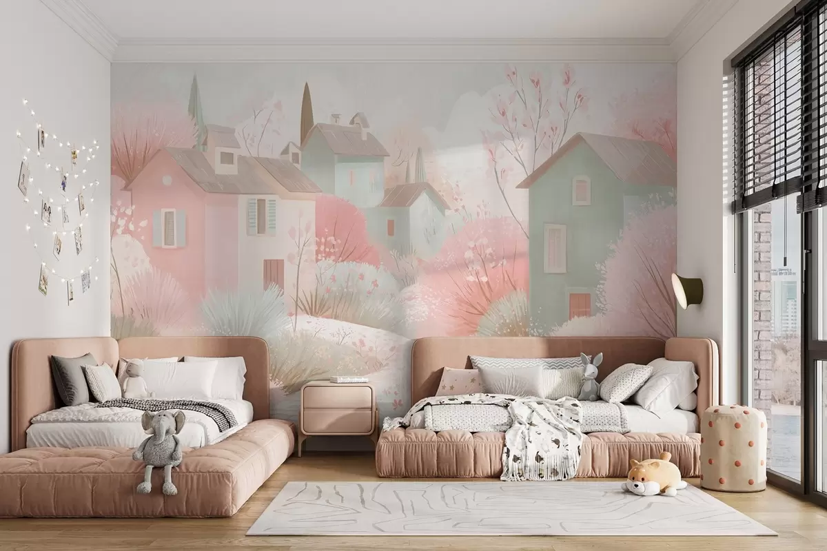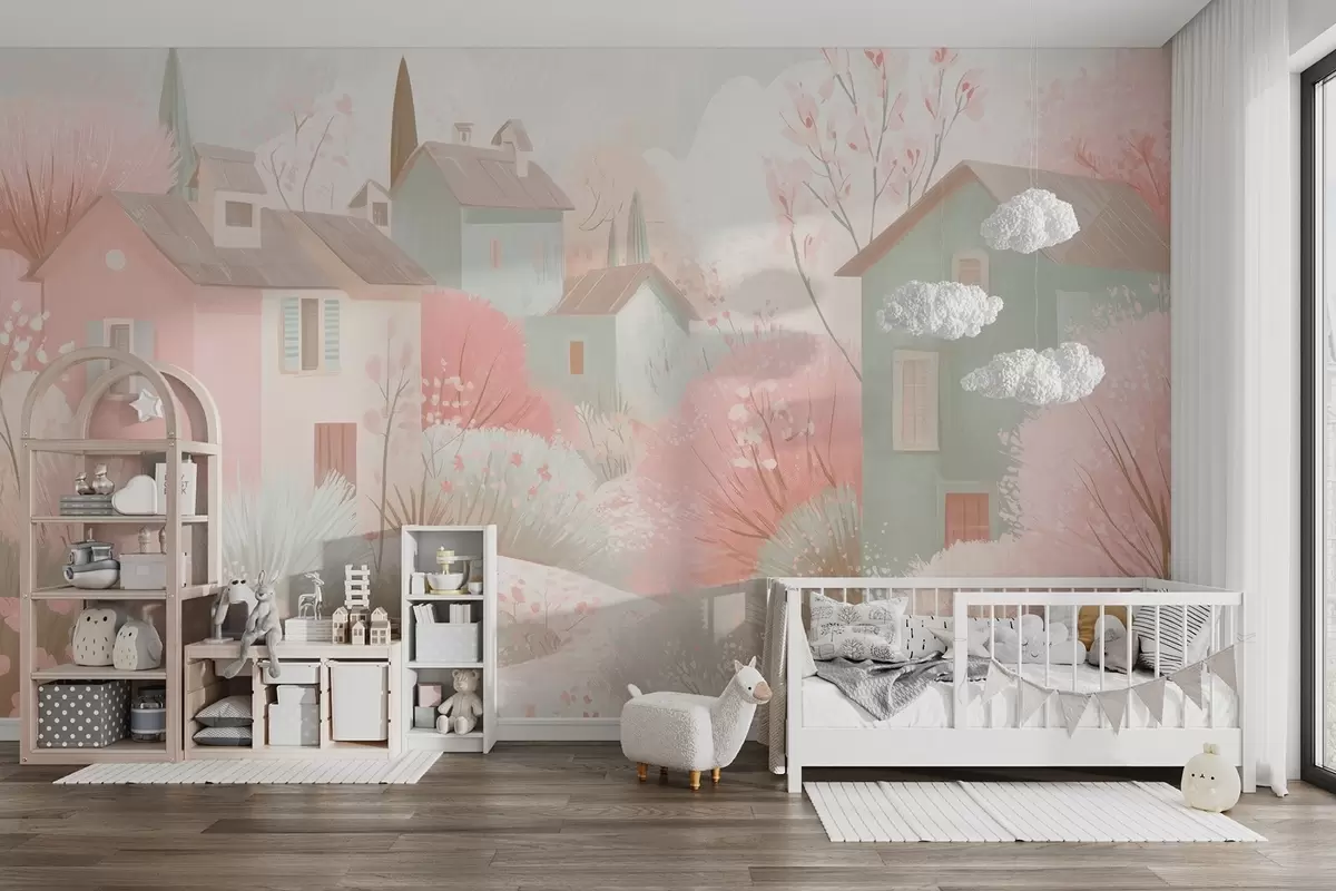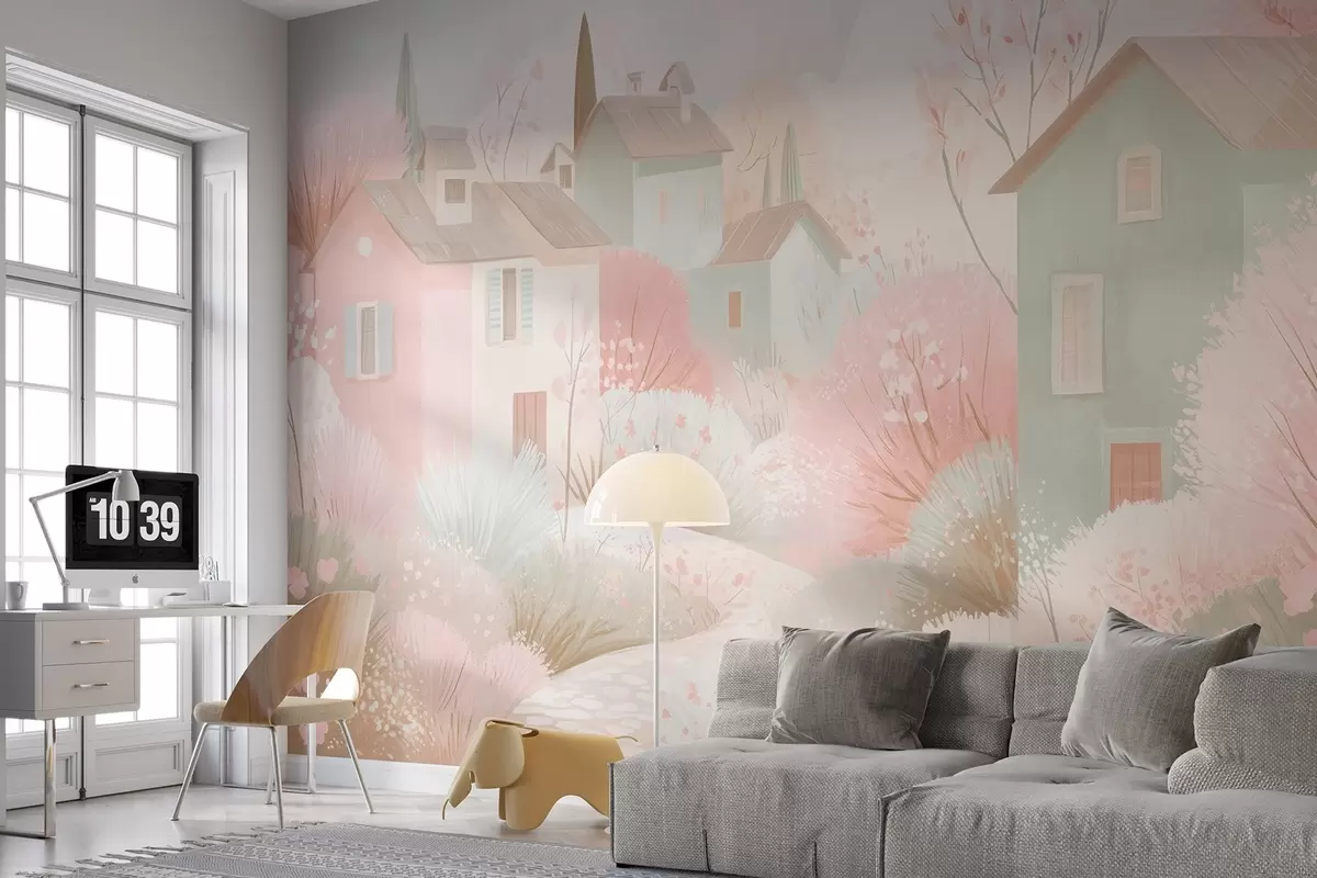 Papier peint Ville de conte de fées dans le style de la peinture à l'huile dans les tons roses N° w09095