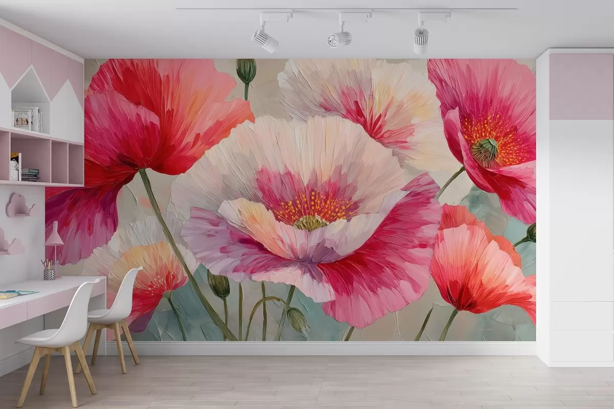 Papier peint Coquelicots blancs et rouges dans un style de peinture à l'huile avec des coups de pinceau audacieux N° w09097