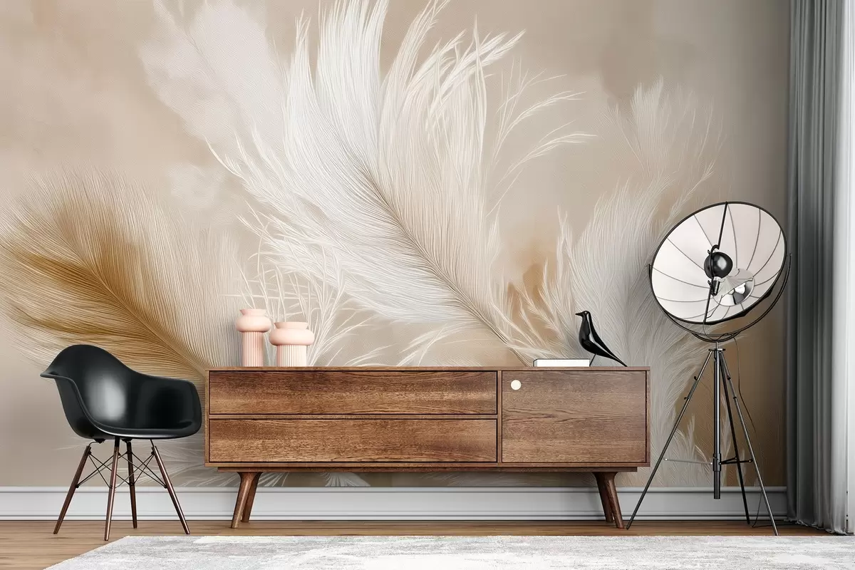 Papier peint Plumes aériennes volantes sur fond beige N° w09102