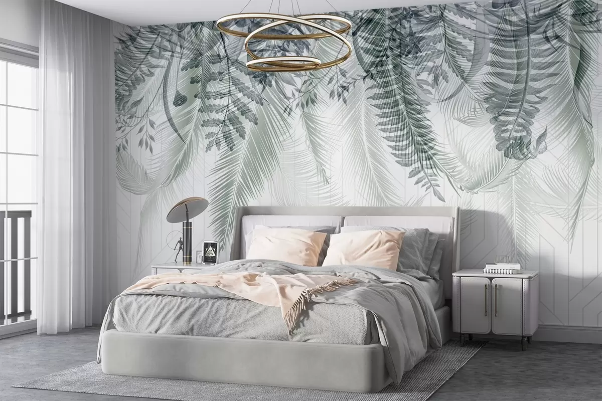Papier peint Délicate chute de fougères tropicales et de feuilles de palmier, arrière-plan géométrique, lumière douce, couleurs sourdes, élégant N° w09106
