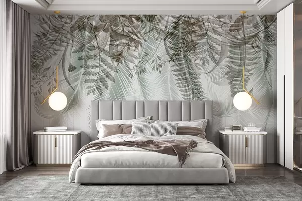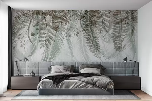 Papier peint Délicate chute de fougères tropicales et de feuilles de palmier, arrière-plan géométrique, lumière douce, couleurs sourdes, élégant N° w09106v1