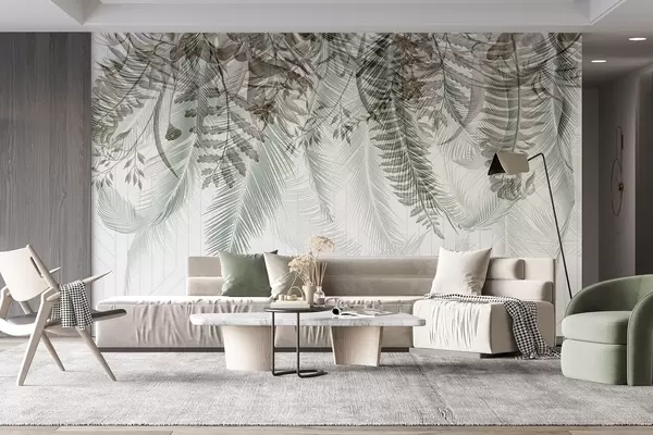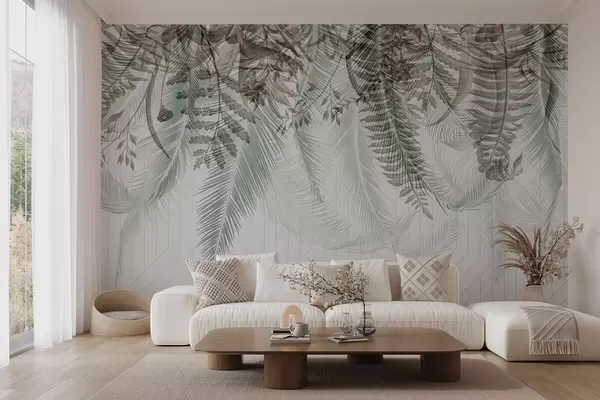 Papier peint Délicate chute de fougères tropicales et de feuilles de palmier, arrière-plan géométrique, lumière douce, couleurs sourdes, élégant N° w09106v1