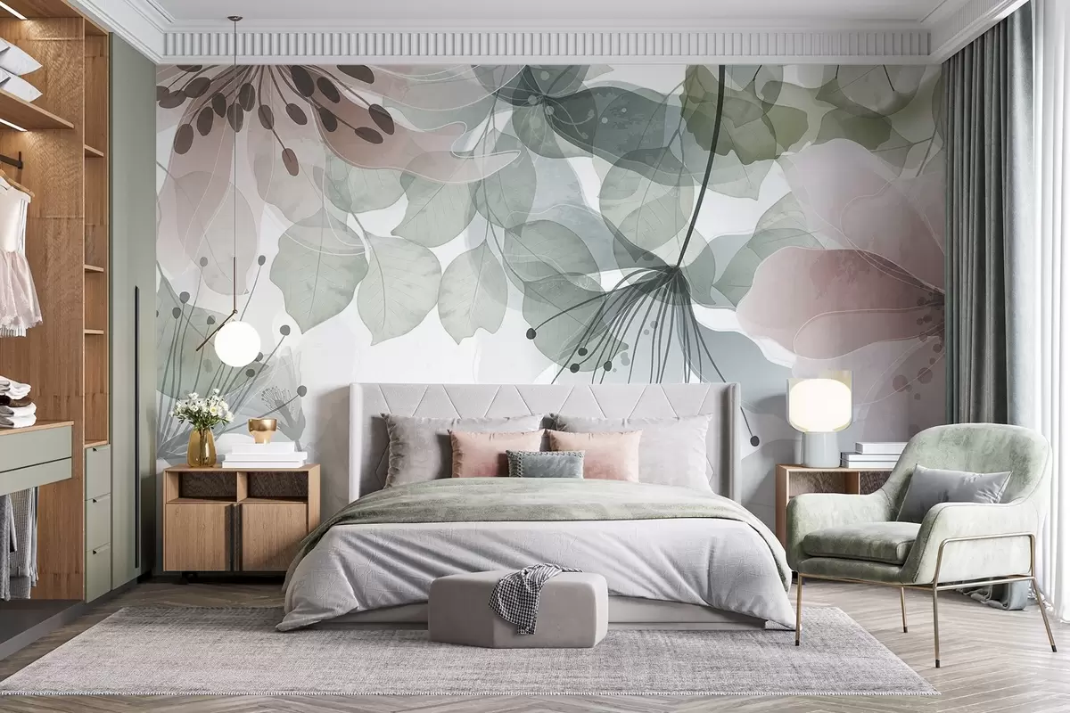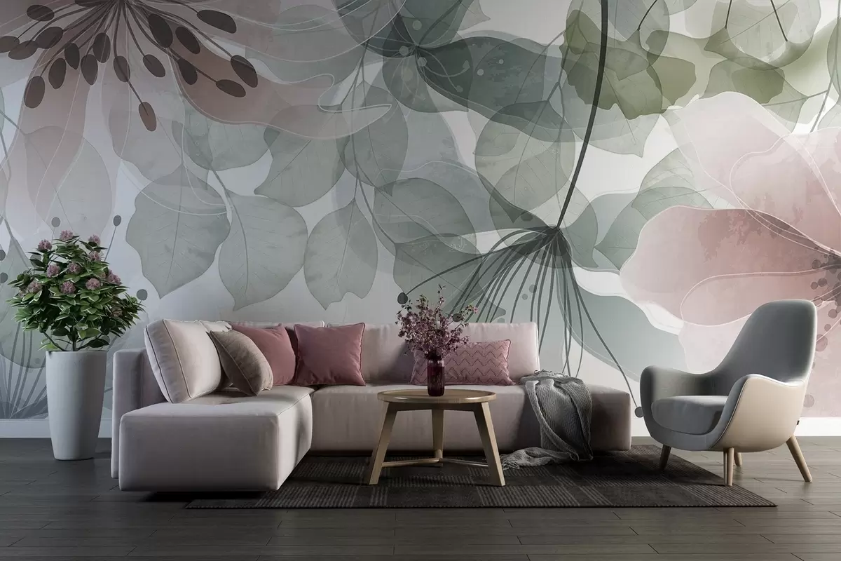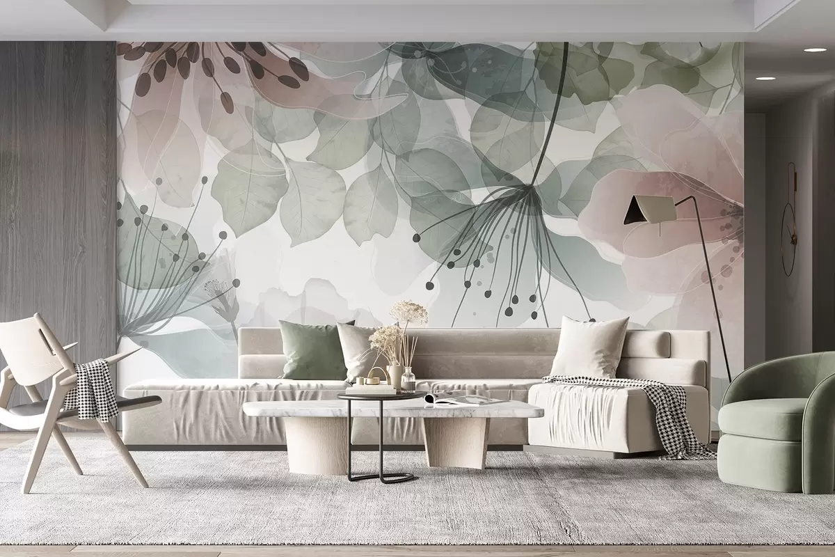 Papier peint Fleurs et feuilles aux couleurs pastel, pétales et feuilles translucides, effet aquarelle doux, lignes délicates, fond blanc N° w09107