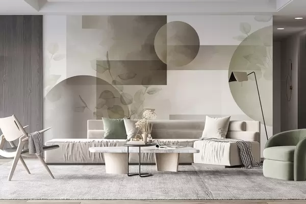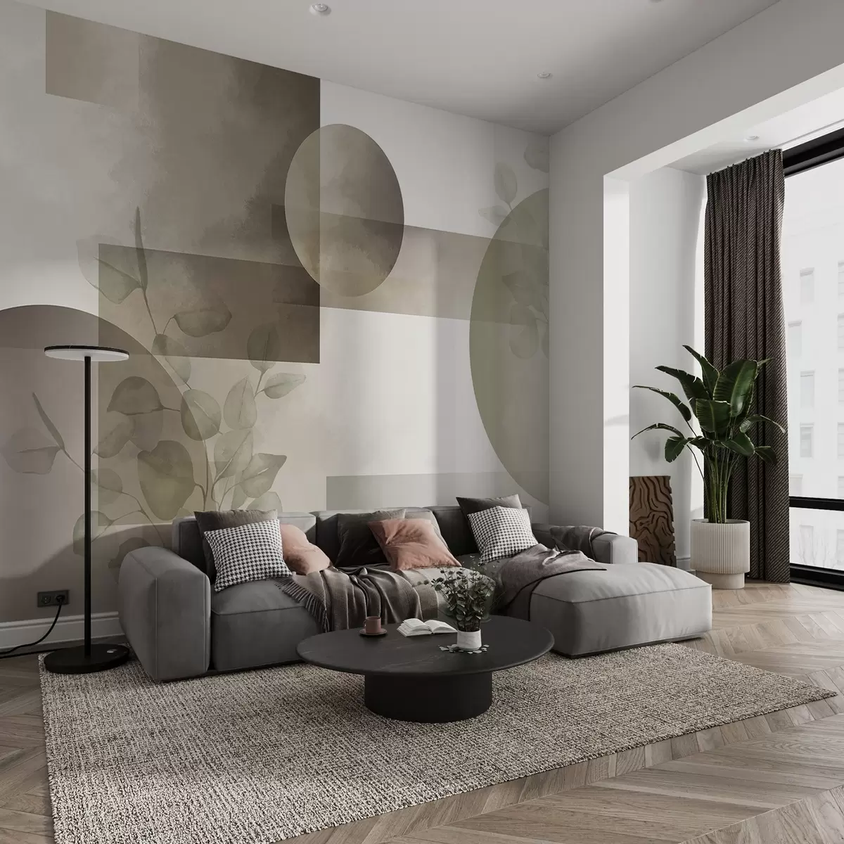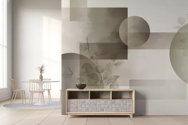 Papier peint Dessin géométrique abstrait moderne minimaliste avec des cercles et des rectangles, feuilles d'eucalyptus, effet aquarelle N° w09110v1