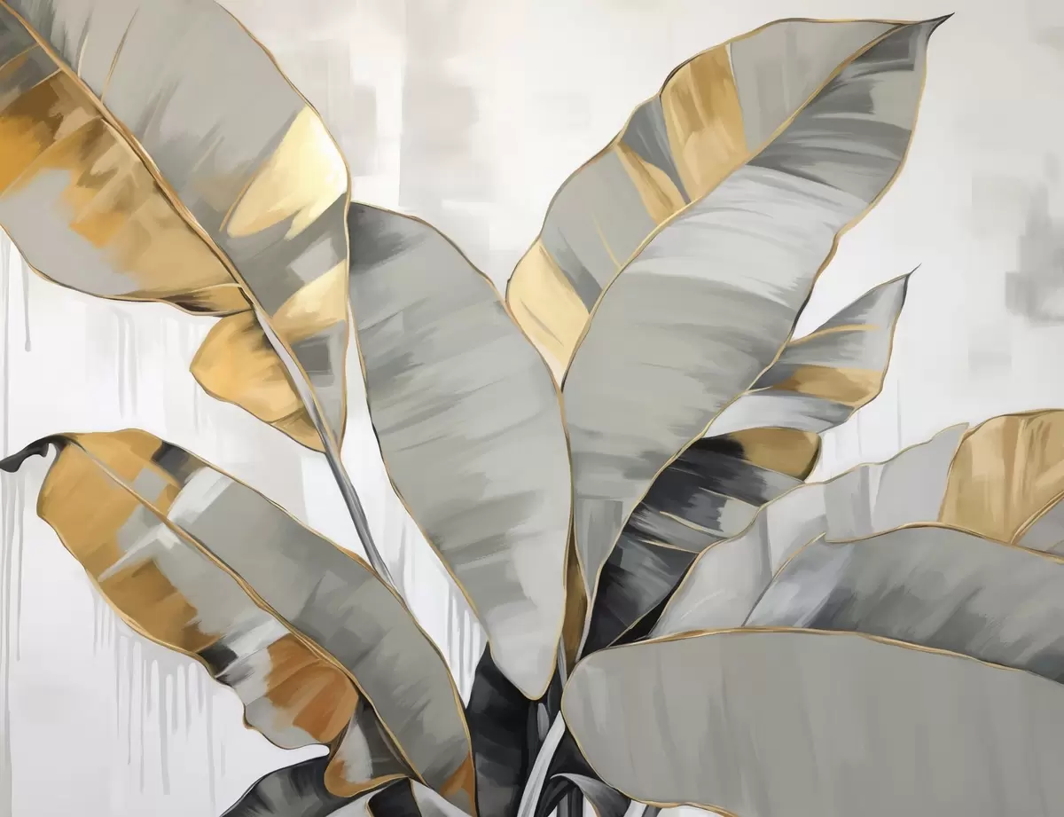 Papier peint Feuilles de bananes tropicales texturées avec des tons gris et jaunes, style moderne, fond neutre, peinture décorative N° w09118