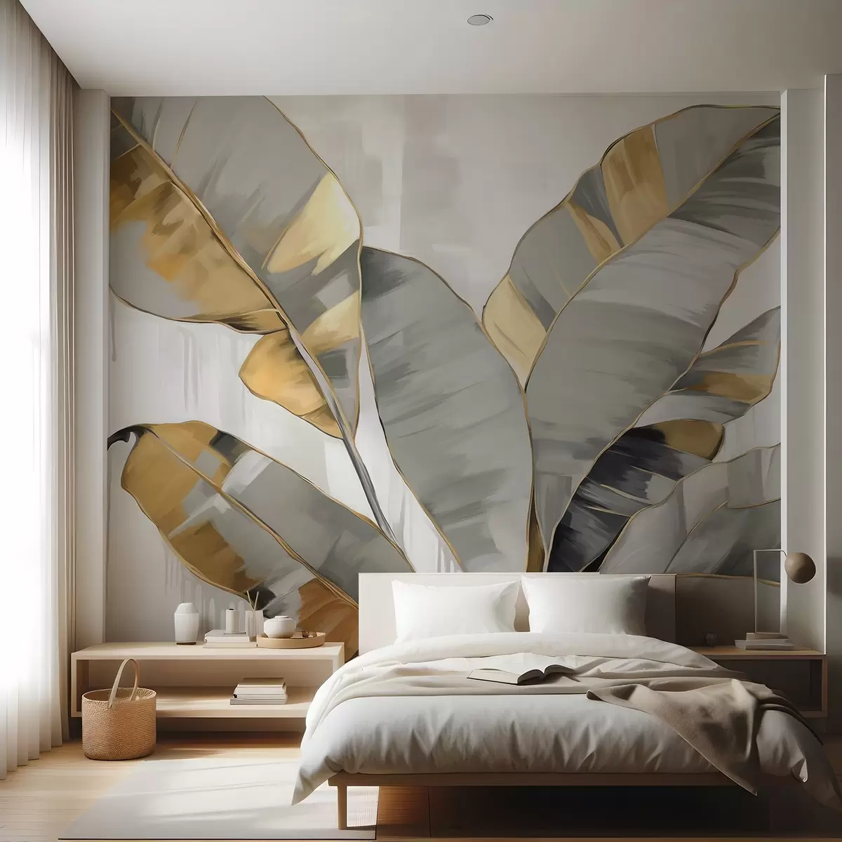 Papier peint Feuilles de bananes tropicales texturées avec des tons gris et jaunes, style moderne, fond neutre, peinture décorative N° w09118