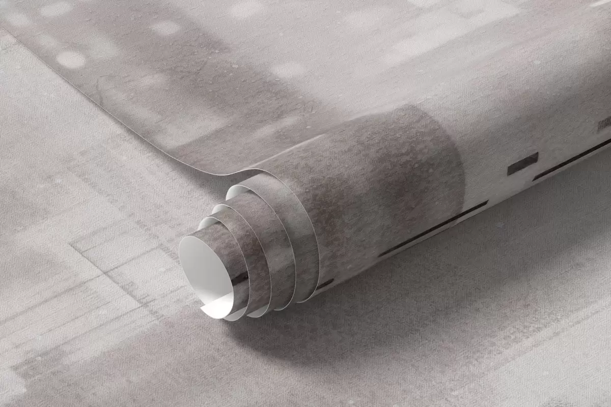 Papier peint Paysage urbain abstrait texturé avec de grands bâtiments et des bandes, dans des tons de gris et de blanc, créant un effet de brume N° w09119
