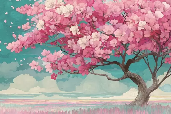 Papier peint Un cerisier rose avec des pétales qui tombent et un ciel bleu dans un style romantique N° w09120