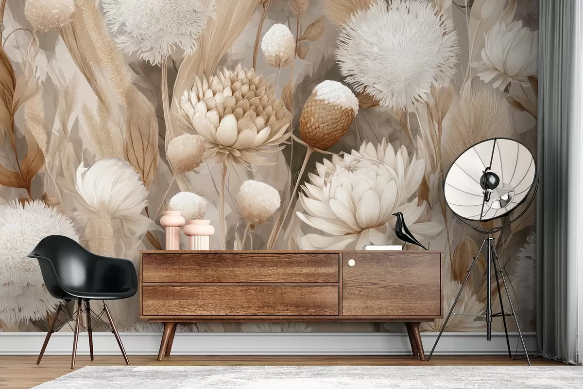 Papier peint Harmonie bohème : Fleurs texturées dans les tons beige et crème N° w09121