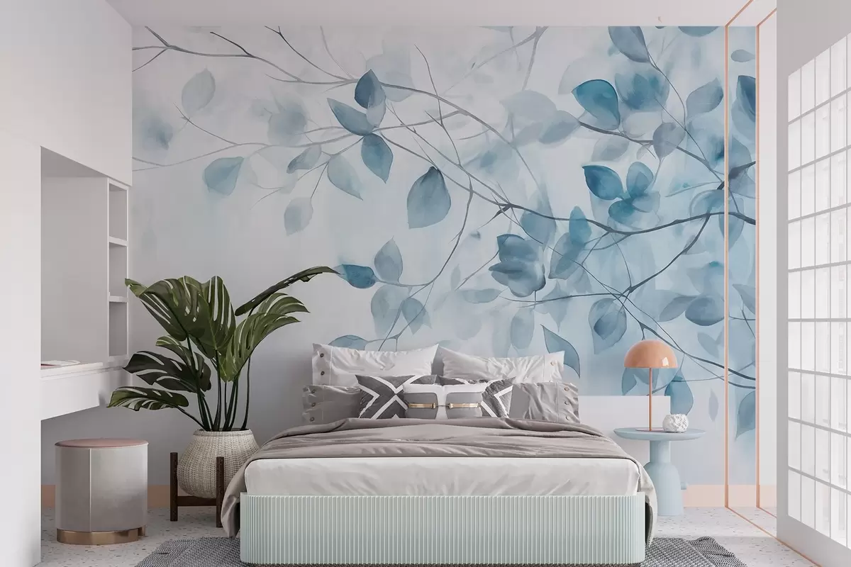 Papier peint Peinture aquarelle texturée imitant les feuilles et les branches bleues, couleurs douces, détails délicats sur fond blanc N° w09133v1