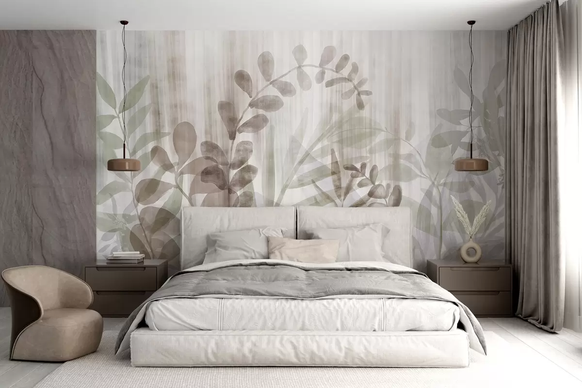 Papier peint Peinture aquarelle imitation plantes avec feuilles multicolores, fond clair avec lignes verticales, illustration botanique N° w09146v1