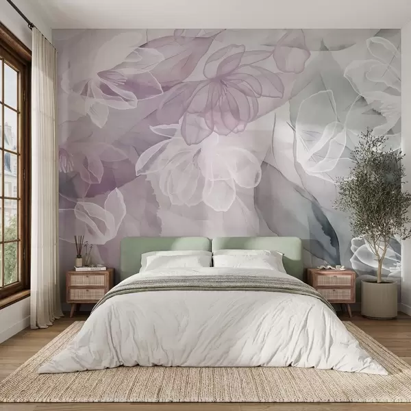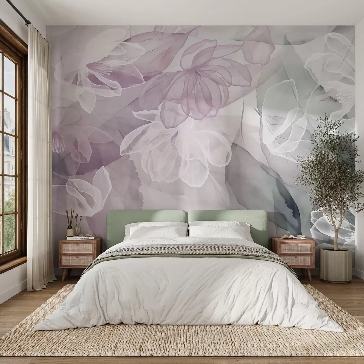 Papier peint Fleurs et feuilles aux pétales transparents dans les tons blanc, rose et vert, doux et délicats N° w09158v1