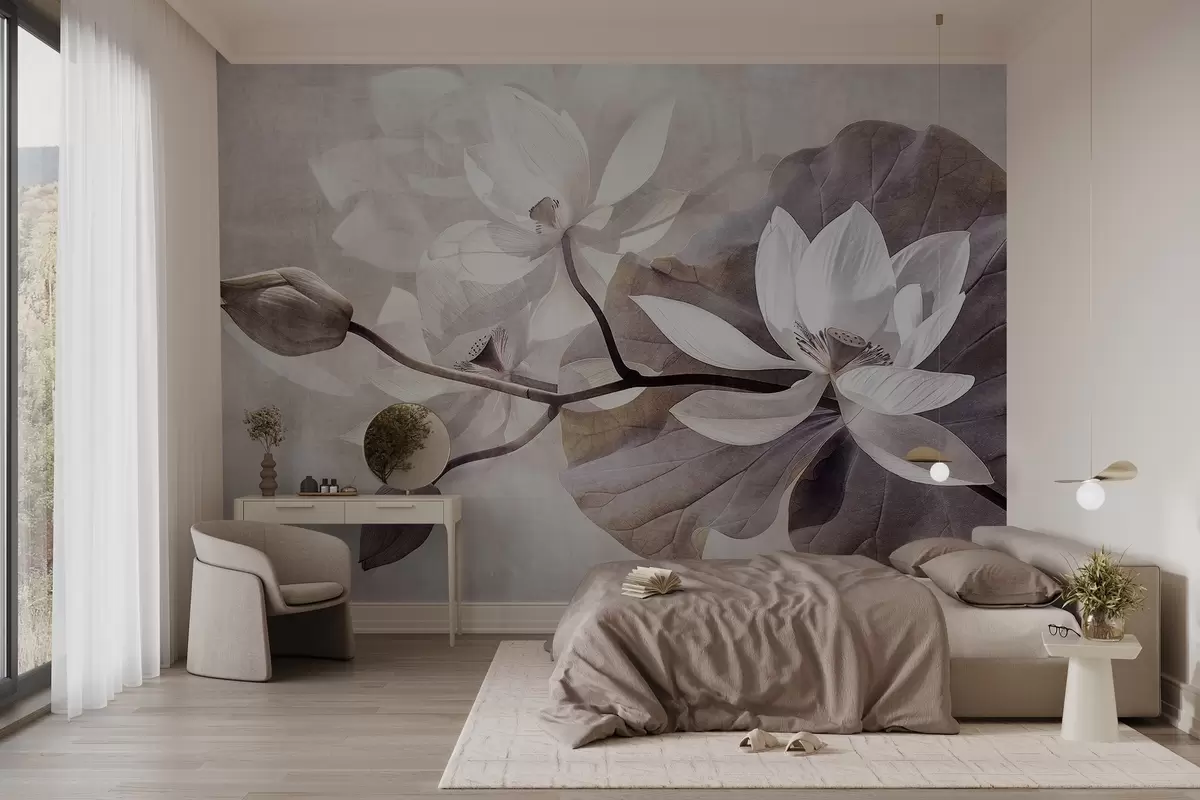 Papier peint Fleurs de lotus délicates avec feuilles et tiges dans une palette de couleurs douces et beiges N° w09159