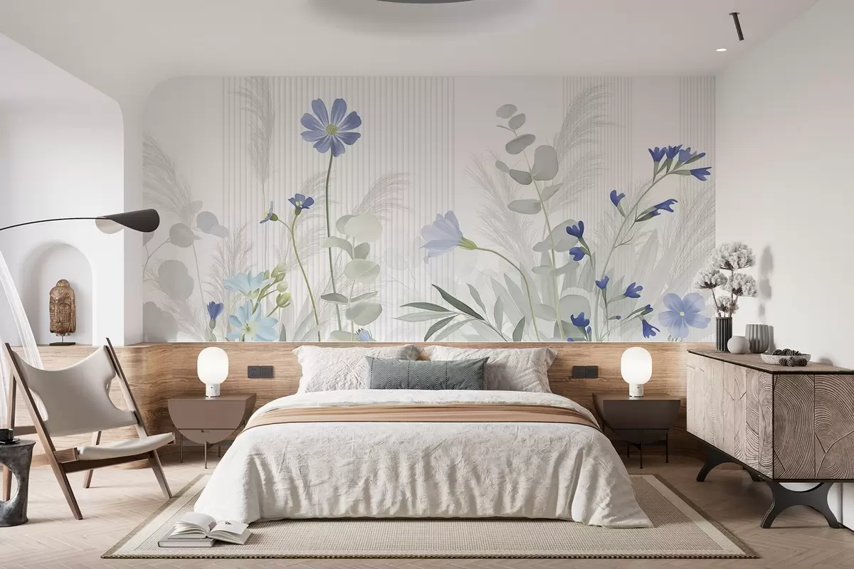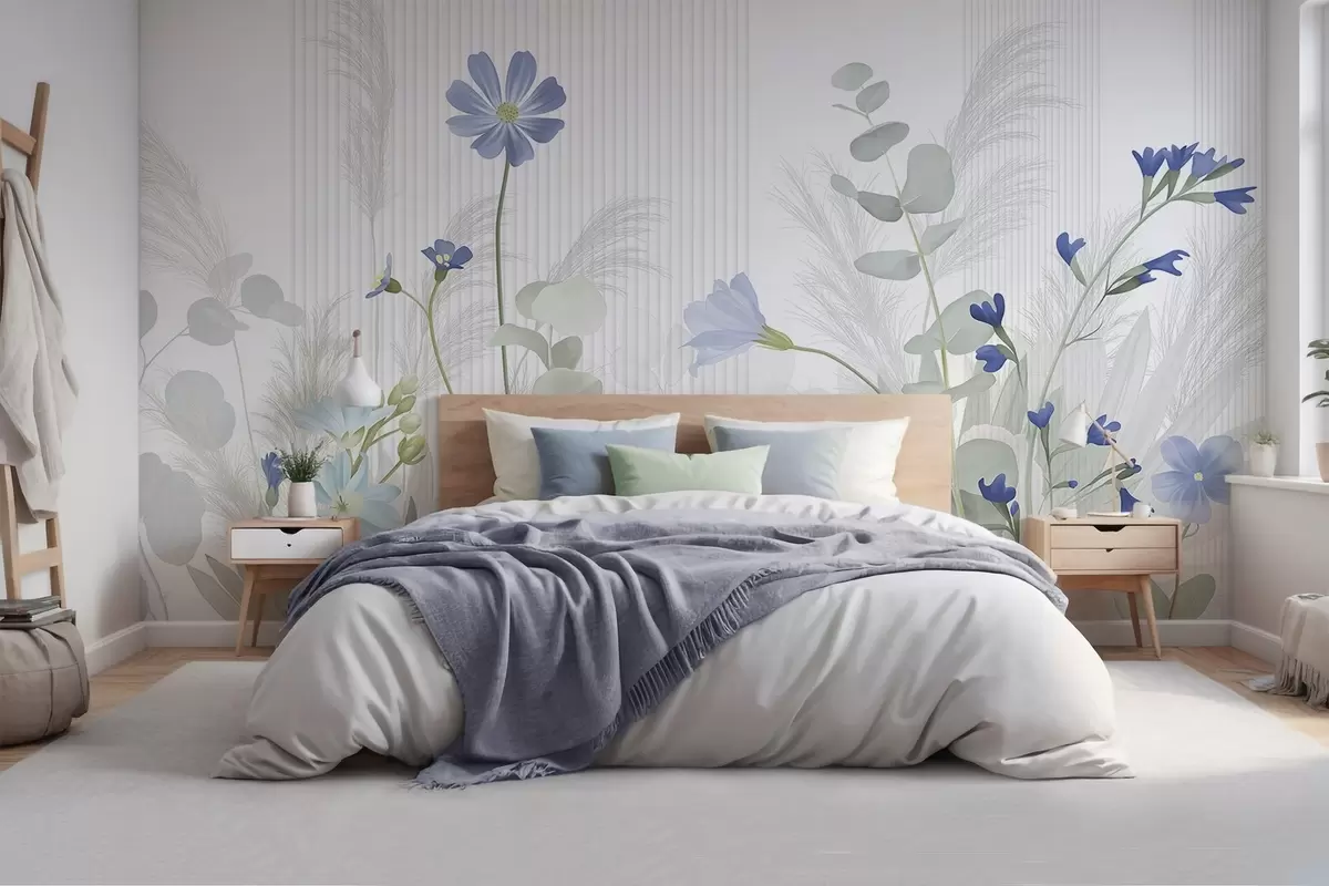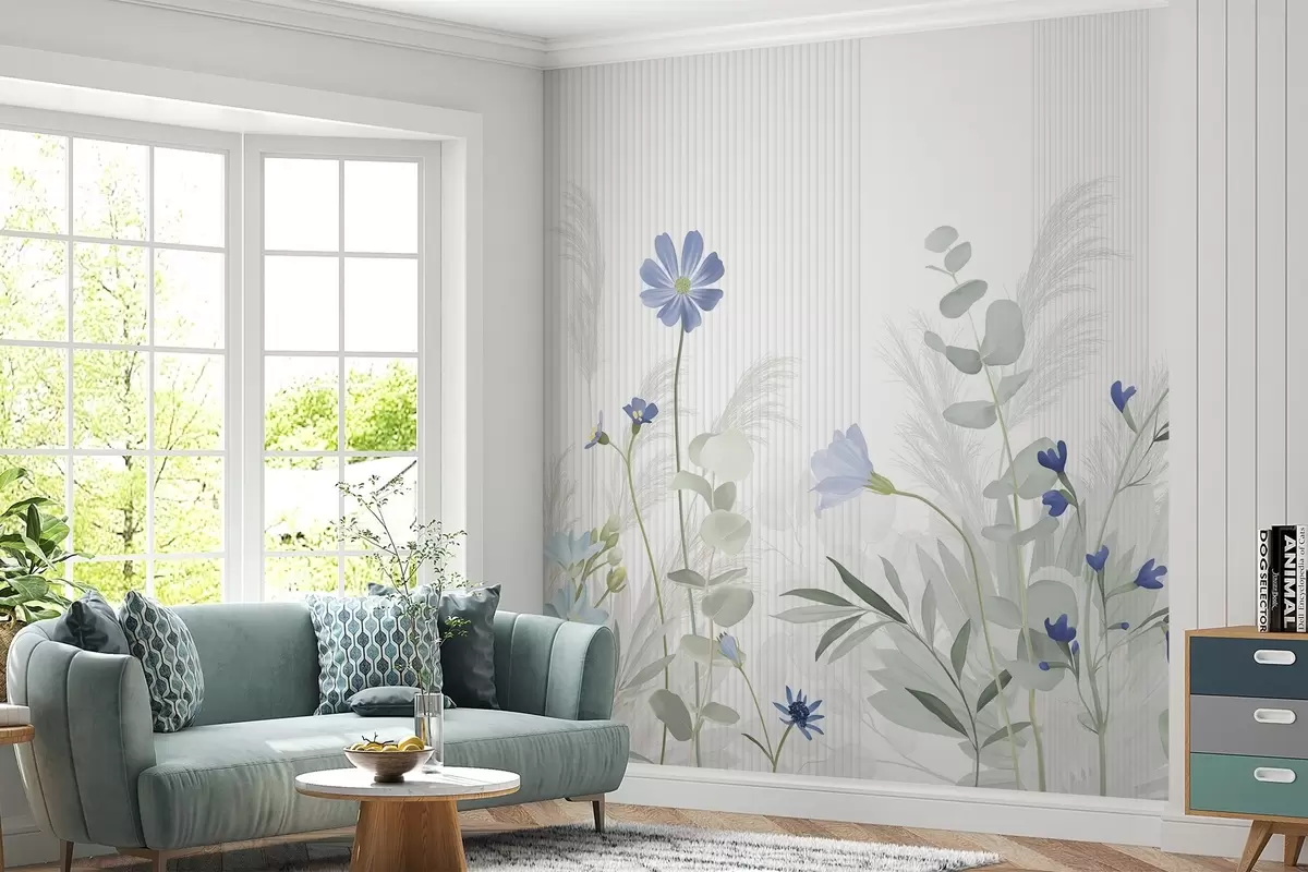 Papier peint Fleurs aux couleurs pastel, feuilles vert clair, fond blanc avec lignes verticales, élégant et minimaliste N° w09161v1