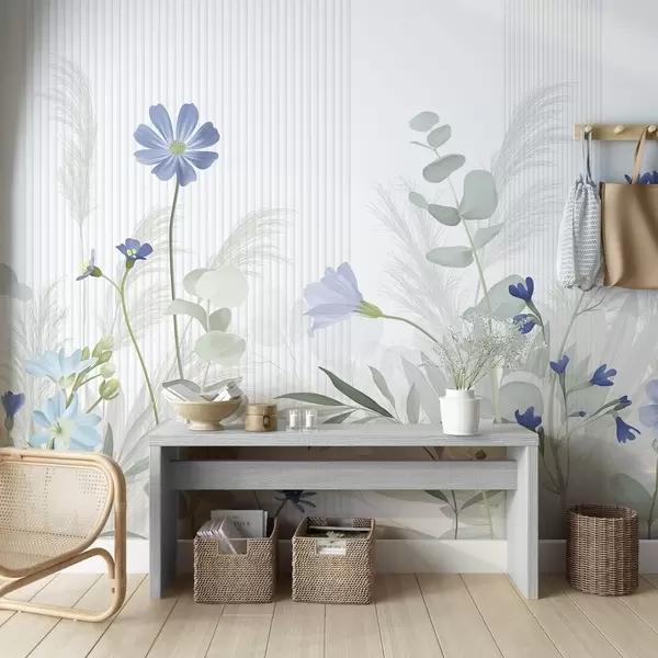 Papier peint Fleurs aux couleurs pastel, feuilles vert clair, fond blanc avec lignes verticales, élégant et minimaliste N° w09161v1