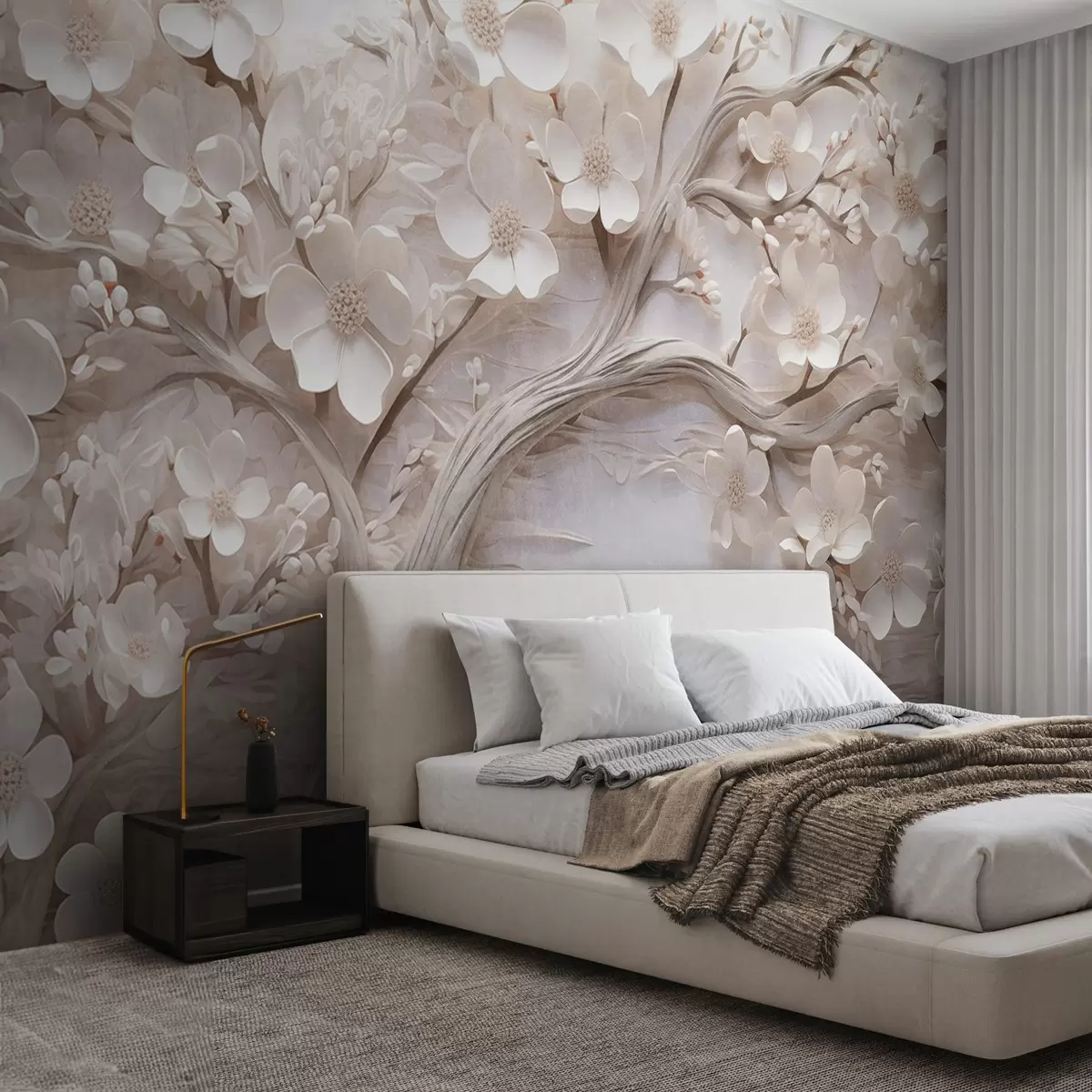 Papier peint Arbre texturé avec des fleurs blanches et un tronc brun, l'arrière-plan est blanc avec des lignes horizontales éclairage doux N° w09166